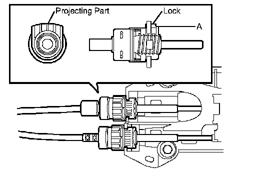 ^ After installation, make sure that the cable outer lock is projecting from A as shown in the illustration.