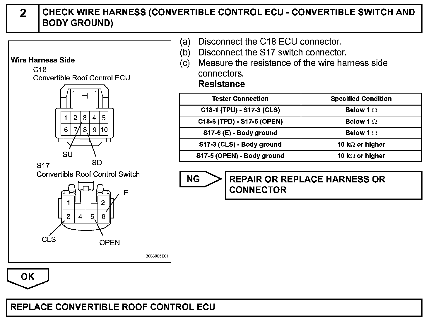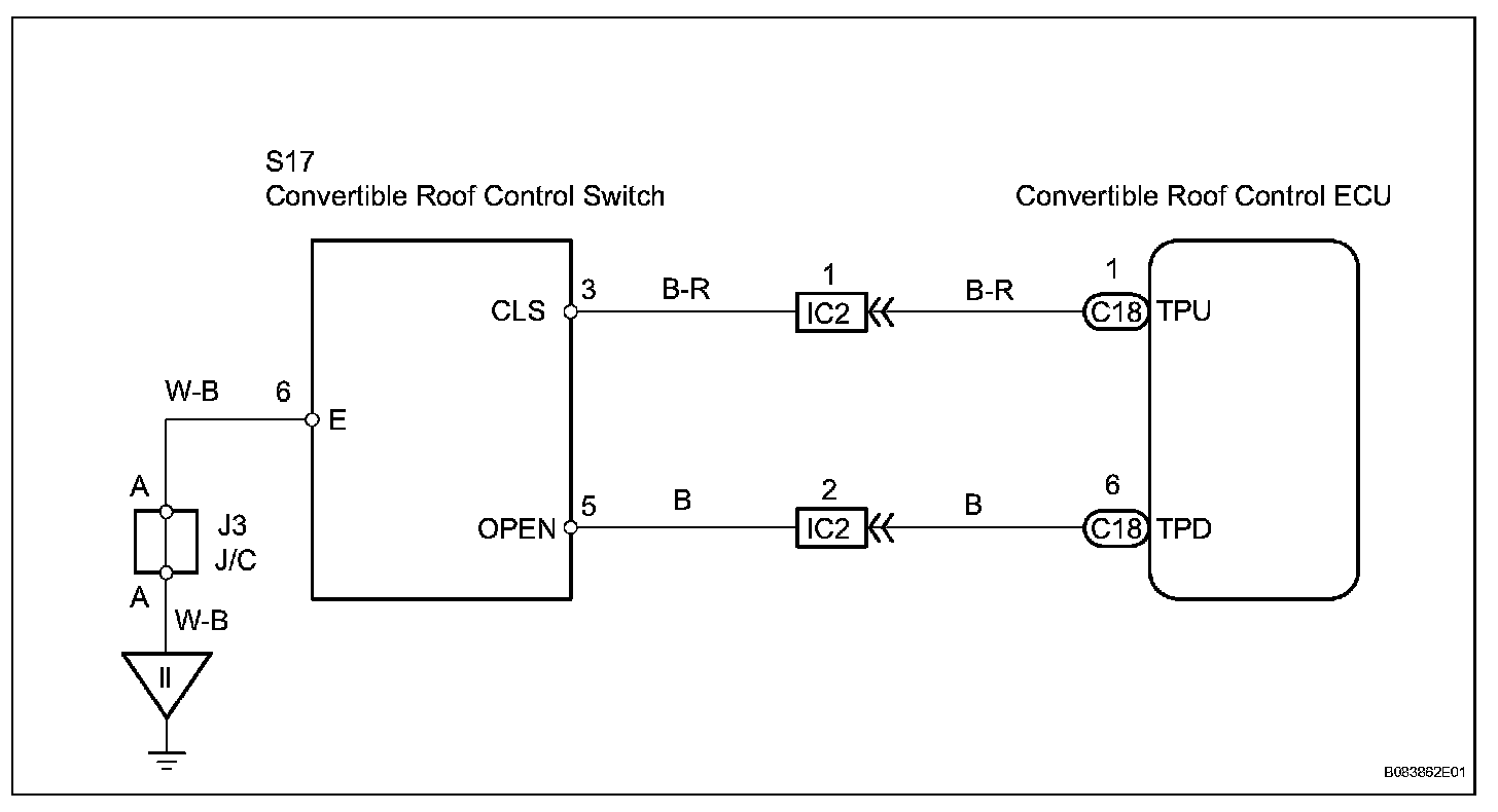 A wire harness connects the convertible roof control switch and the convertible roof control ECU. If the roof's operating conditions are met, the roof motors, door window motors and quarter window motors will operate according to switch input.