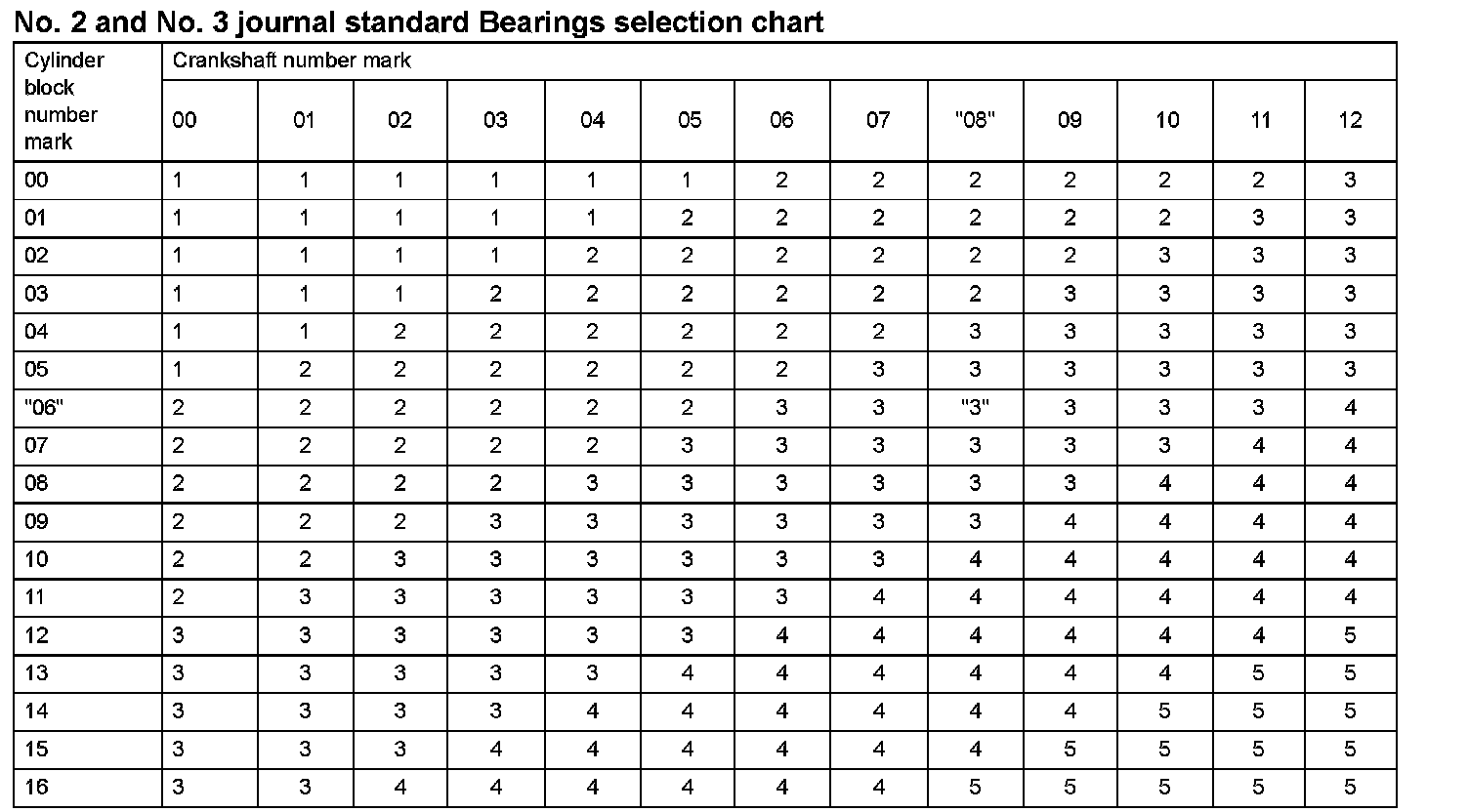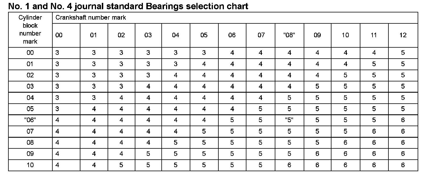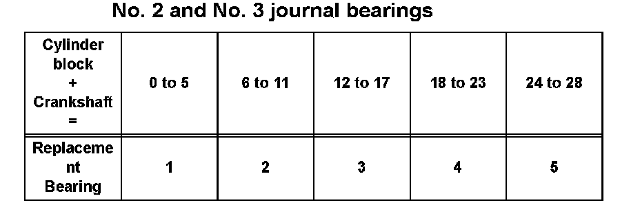 HINT: If using a bearing, replace it with one that has the same number. If the number of the bearing cannot be determined, select the correct bearing by adding together the numbers imprinted on the cylinder block and crankshaft, then refer to the table for the appropriate bearing number. The No. 1 and No. 4 journal bearings have 5 standard bearing sizes, marked 3, 4, 5, 6 and 7 accordingly. The No. 2 and No. 3 journal bearings have 5 standard bearing sizes, marked 1, 2, 3, 4 and 5 accordingly.