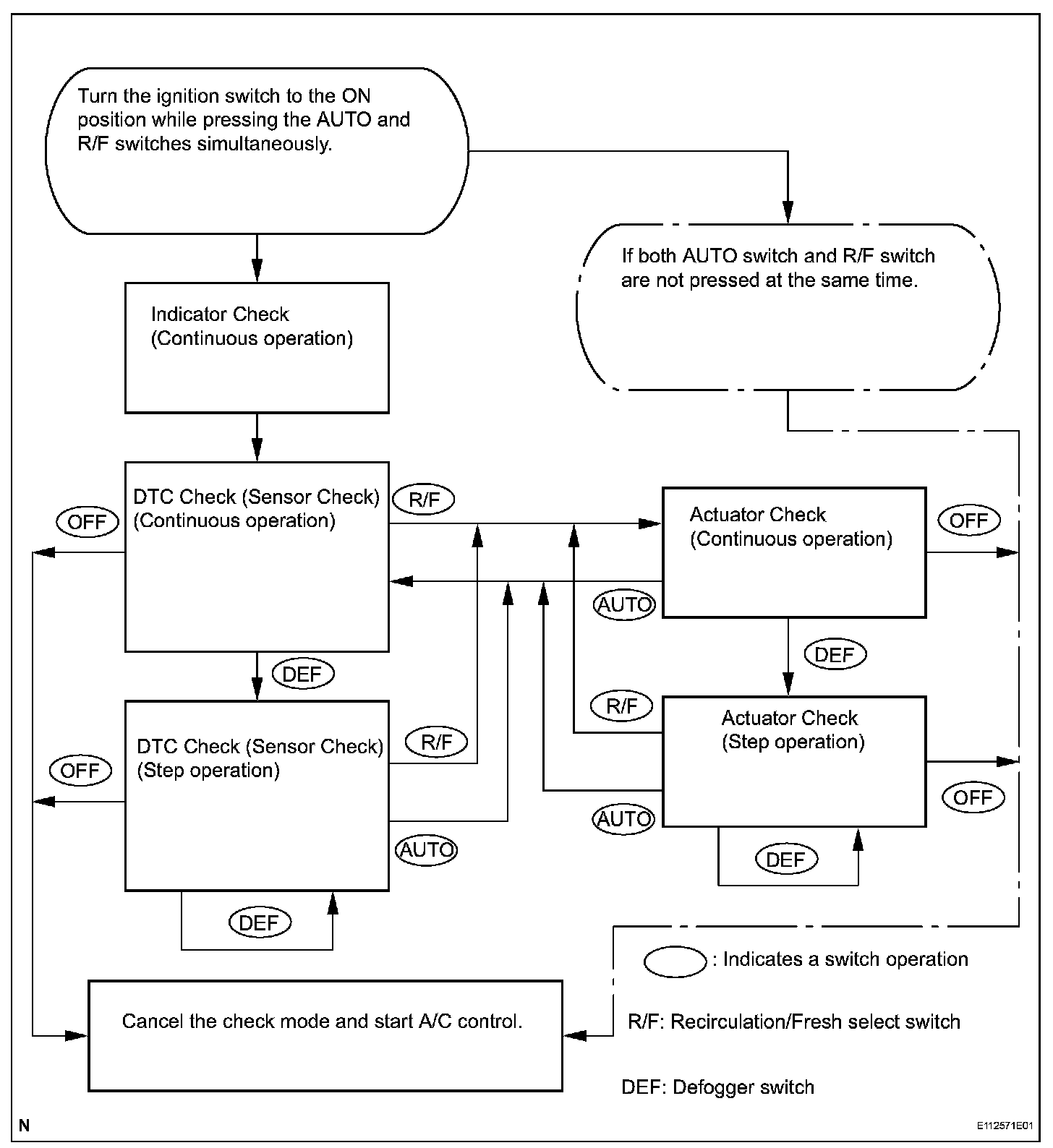By operating each of the A/C control switches as shown in the diagram, it is possible to enter the diagnostic check mode.