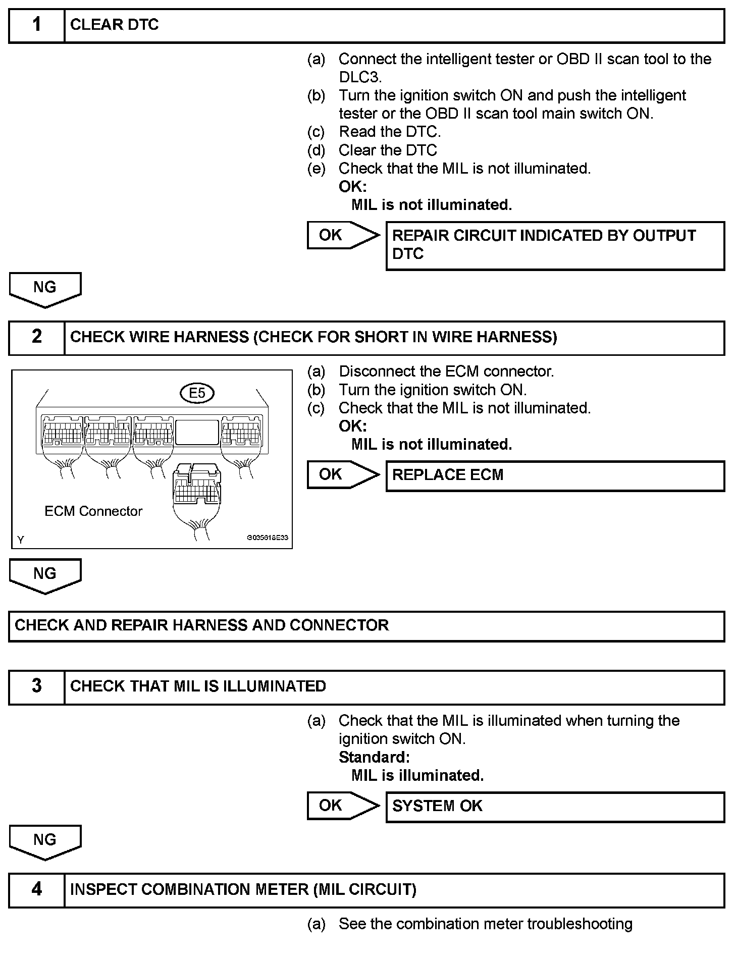 The MIL should be illuminated when the ignition switch is first turned ON. If the MIL is always ON or OFF, use the intelligent tester or OBD II scan tool and follow the procedures to determine the cause of the problem.