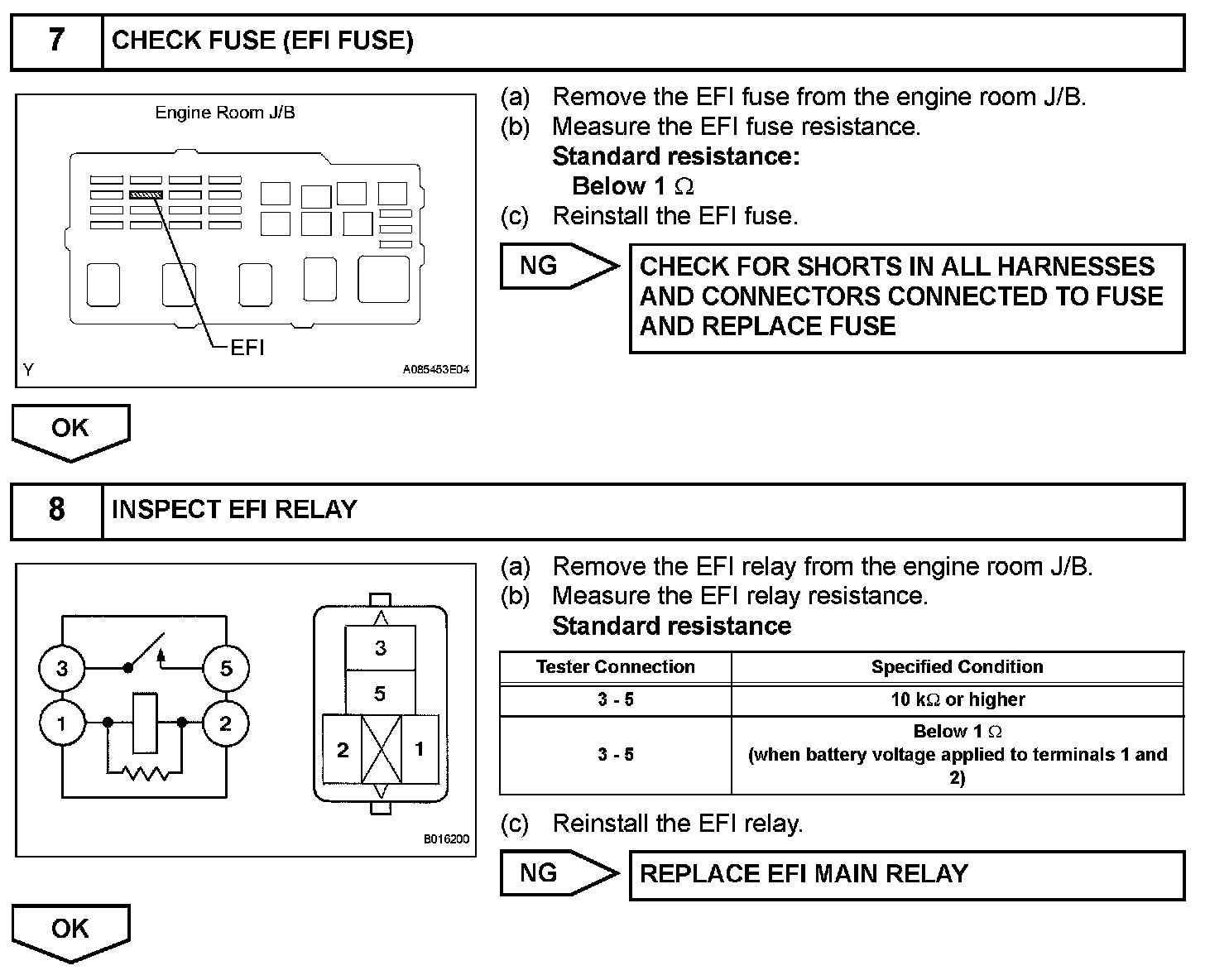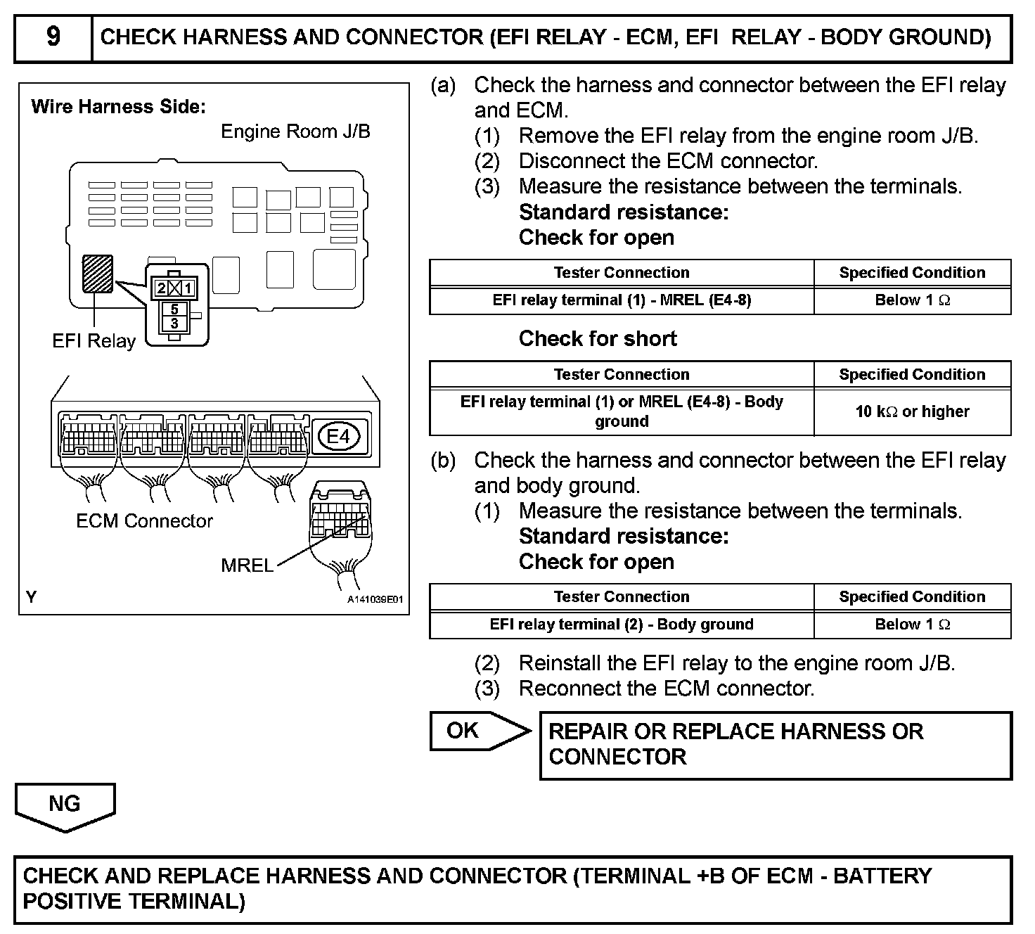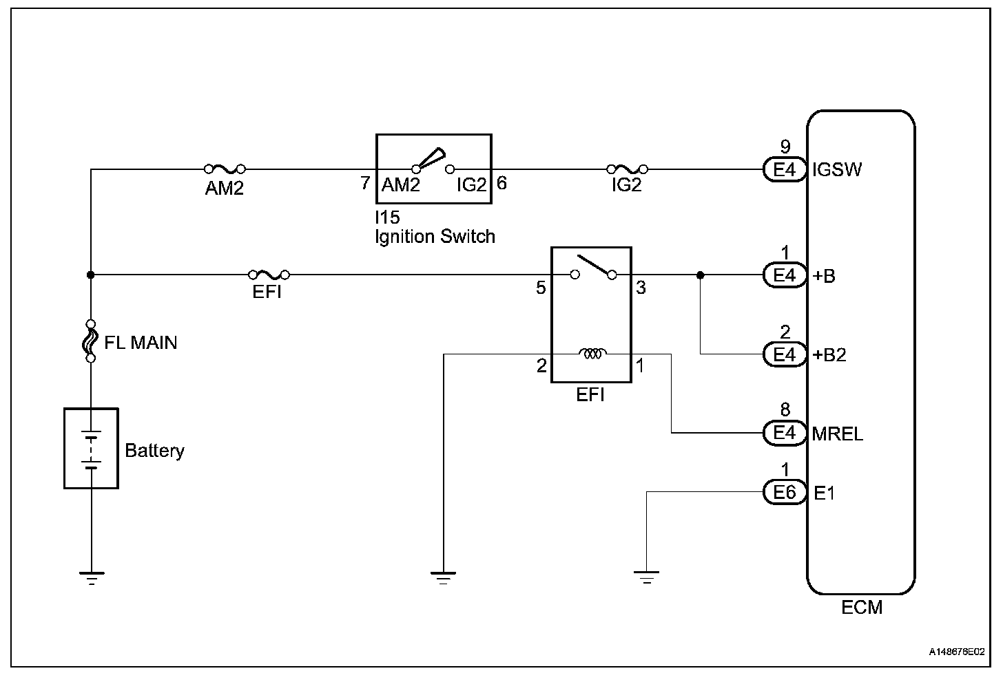 When the ignition switch is turned to the ON position, the battery voltage is applied to terminal IGSW of the ECM. The ECM MREL output signal causes a current to flow to the coil, closing the contacts of the EFI relay and supplying power to terminal +B of the ECM. If the ignition switch is turned off, the ECM holds the EFI relay ON for a maximum of 2 seconds to allow for the initial setting of the throttle valve.