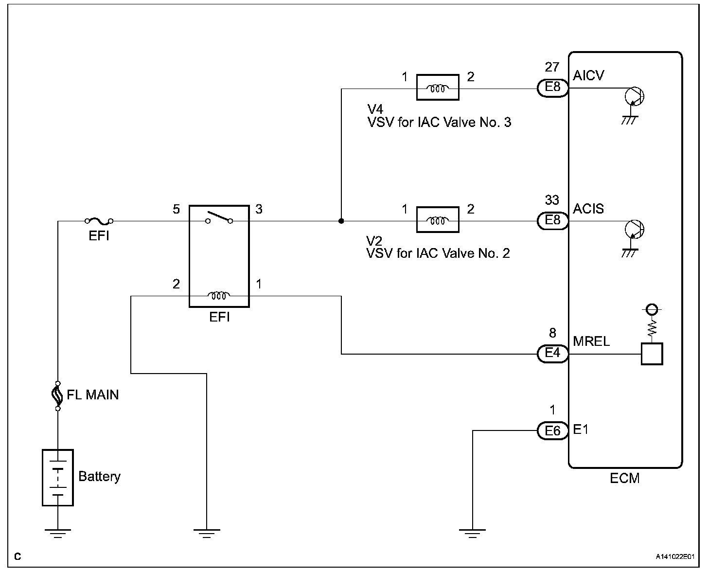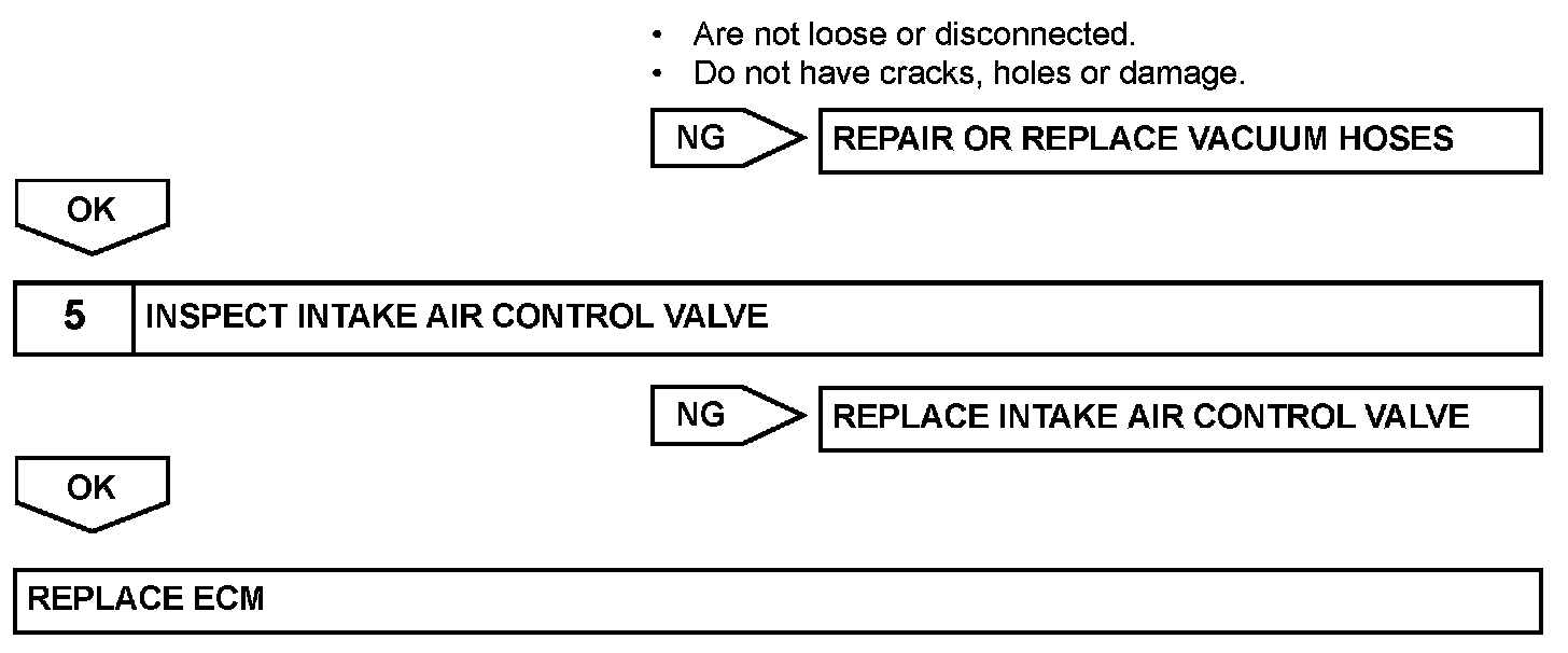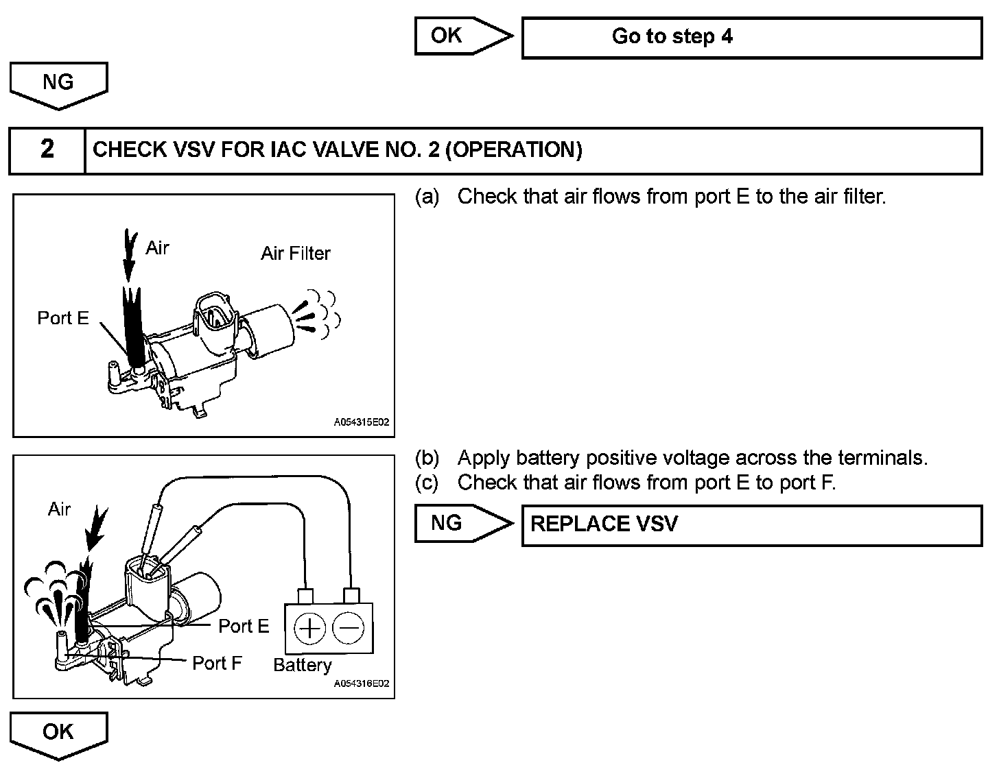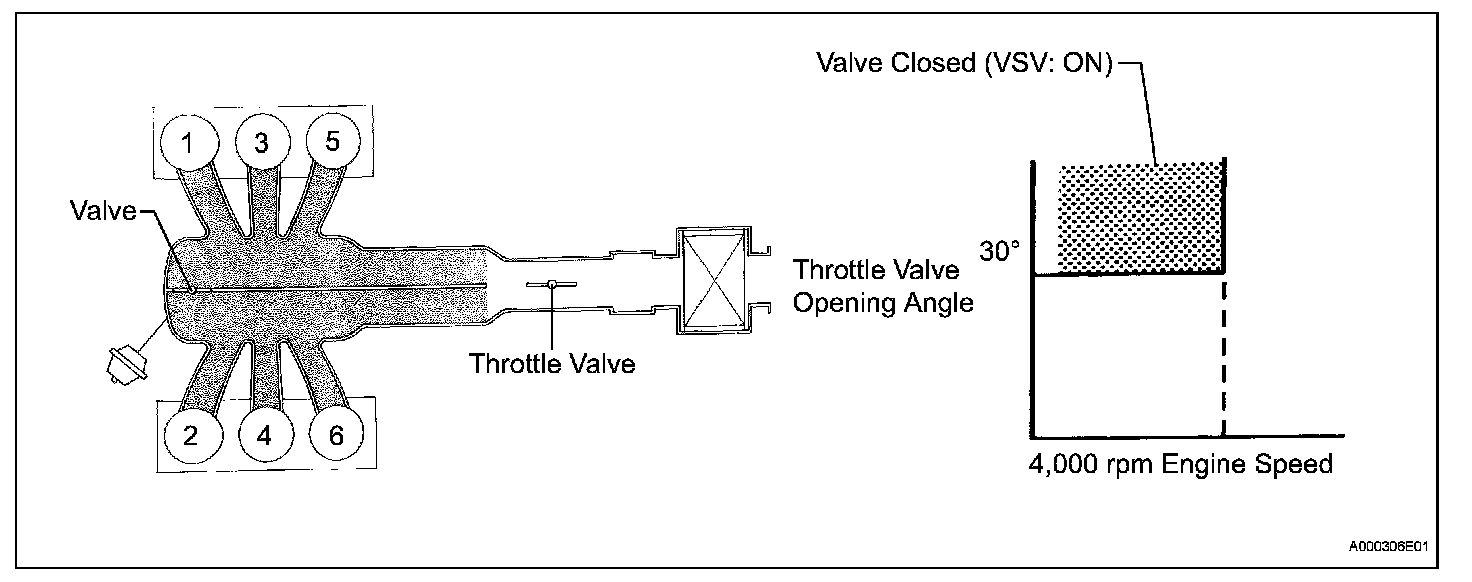The ECM opens and closes the Intake Air Control (IAC) valve No. 2 in response to engine speed (RPM/NE). This system improves intake manifold tuning for better efficiency at low and high engine rpm. When the engine speed is 4,000 rpm or less and the throttle valve opening angle is 30 ° or more, the ECM turns the VSV ON to operate the IAC valve.