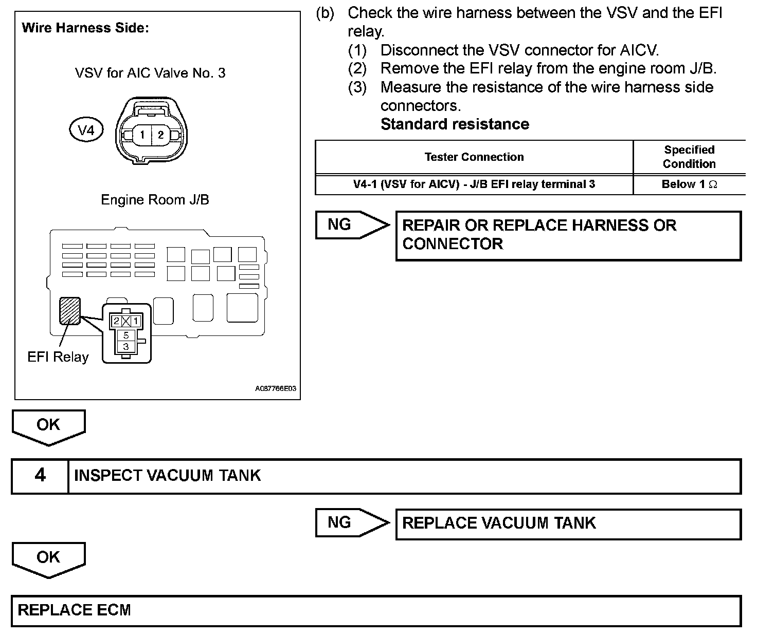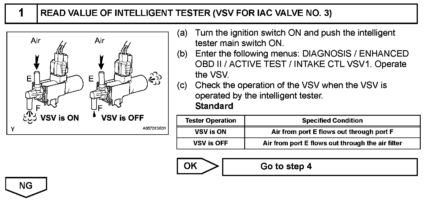 When the engine is operating at low to mid speeds, this system operates the IAC valve to close one of the air cleaner inlets. When the engine speed is more than 3,200 rpm and the opening angle of the throttle valve is more than 30°, the ECM activates the VSV and opens the IAC valve No. 3.