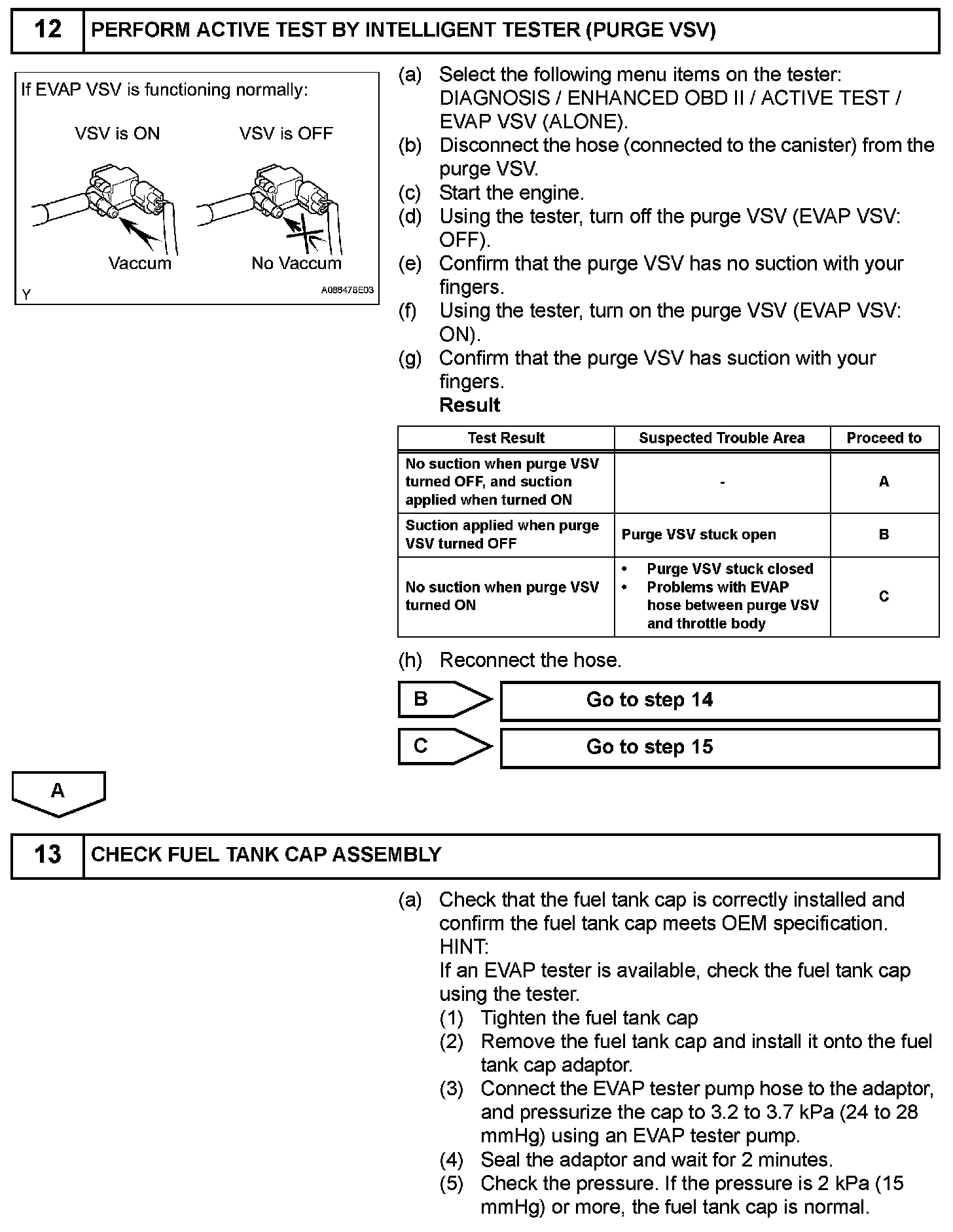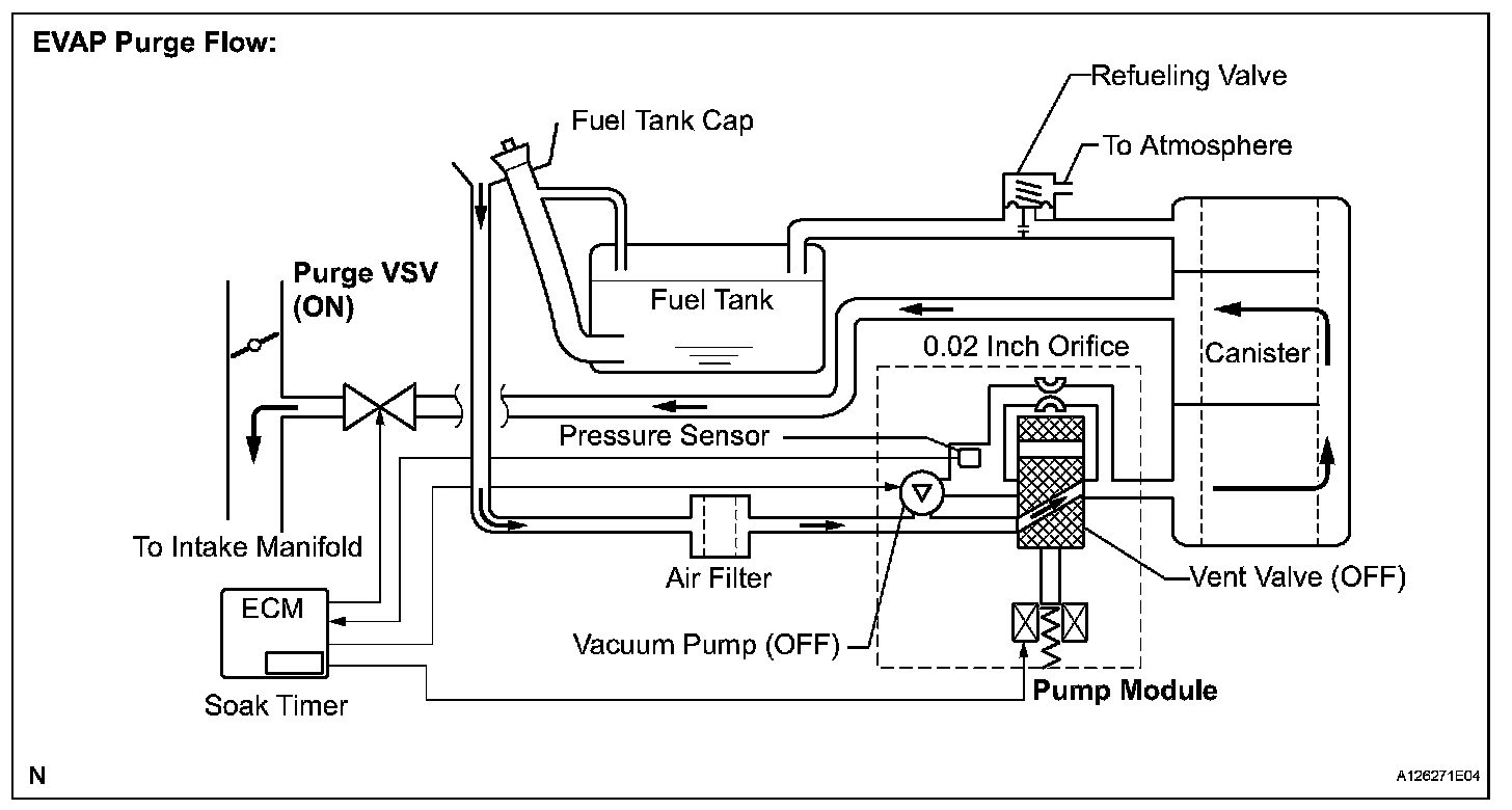 While the engine is running, if a predetermined condition (closed-loop, etc.) is met, the purge VSV is opened by the ECM and fuel vapors stored in the canister are purged to the intake manifold. The ECM changes the duty cycle ratio of the purge VSV to control purge flow volume. The purge flow volume is also determined by the intake manifold pressure. Atmospheric pressure is allowed into the canister through the vent valve to ensure that the purge flow is maintained when negative pressure (vacuum) is applied to the canister. The following two monitors run to confirm appropriate EVAP system operation.