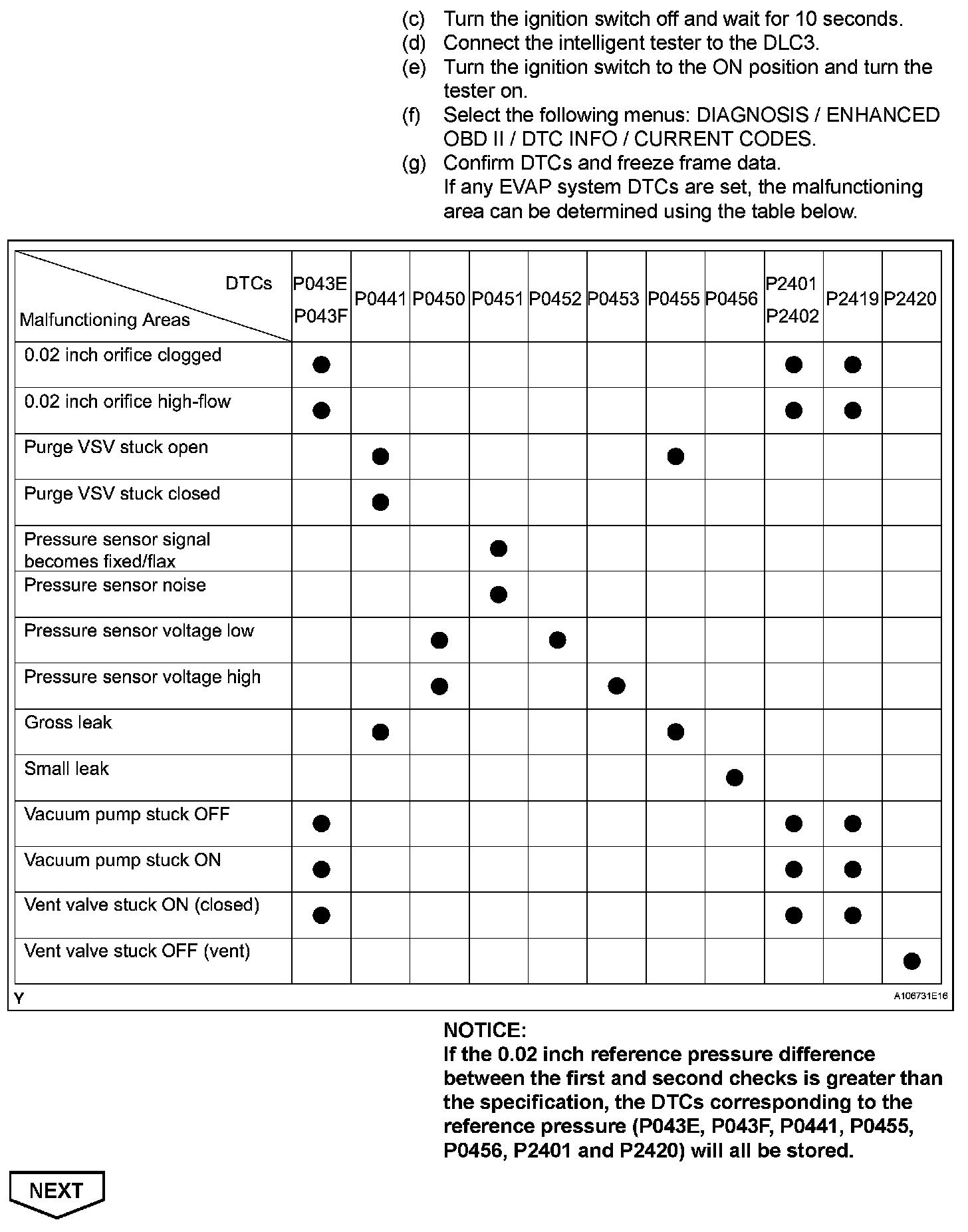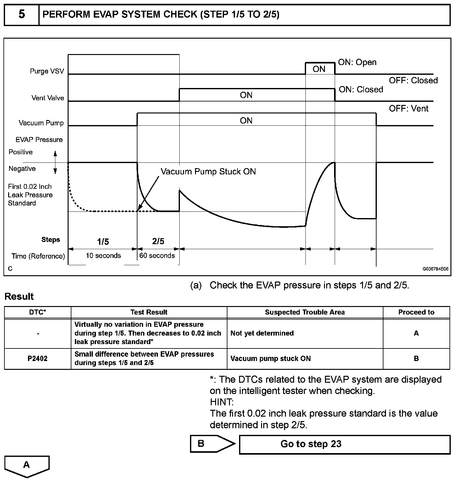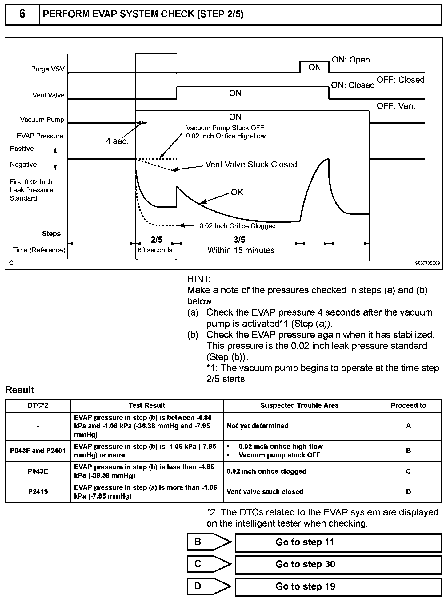 NOTE: If the 0.02 inch reference pressure difference between the first and second checks is greater than the specification, the DTCs corresponding to the reference pressure (P043E, P043F, P0441, P0455, P0456, P2401, P2420) will be all stored.