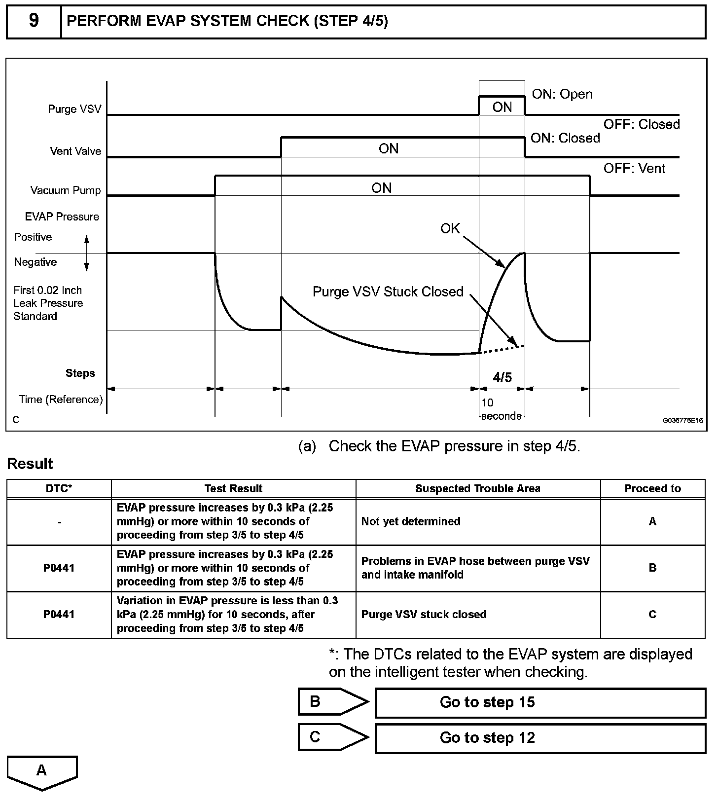 The vent valve is turned OFF (open) and the EVAP pressure is then measured. If the variation in the pressure is less than 0.5 kPa (3.75 mmHg), the ECM interprets this as the purge VSV being stuck closed, and illuminates the MIL and sets DTC P0441 (2 trip detection logic).