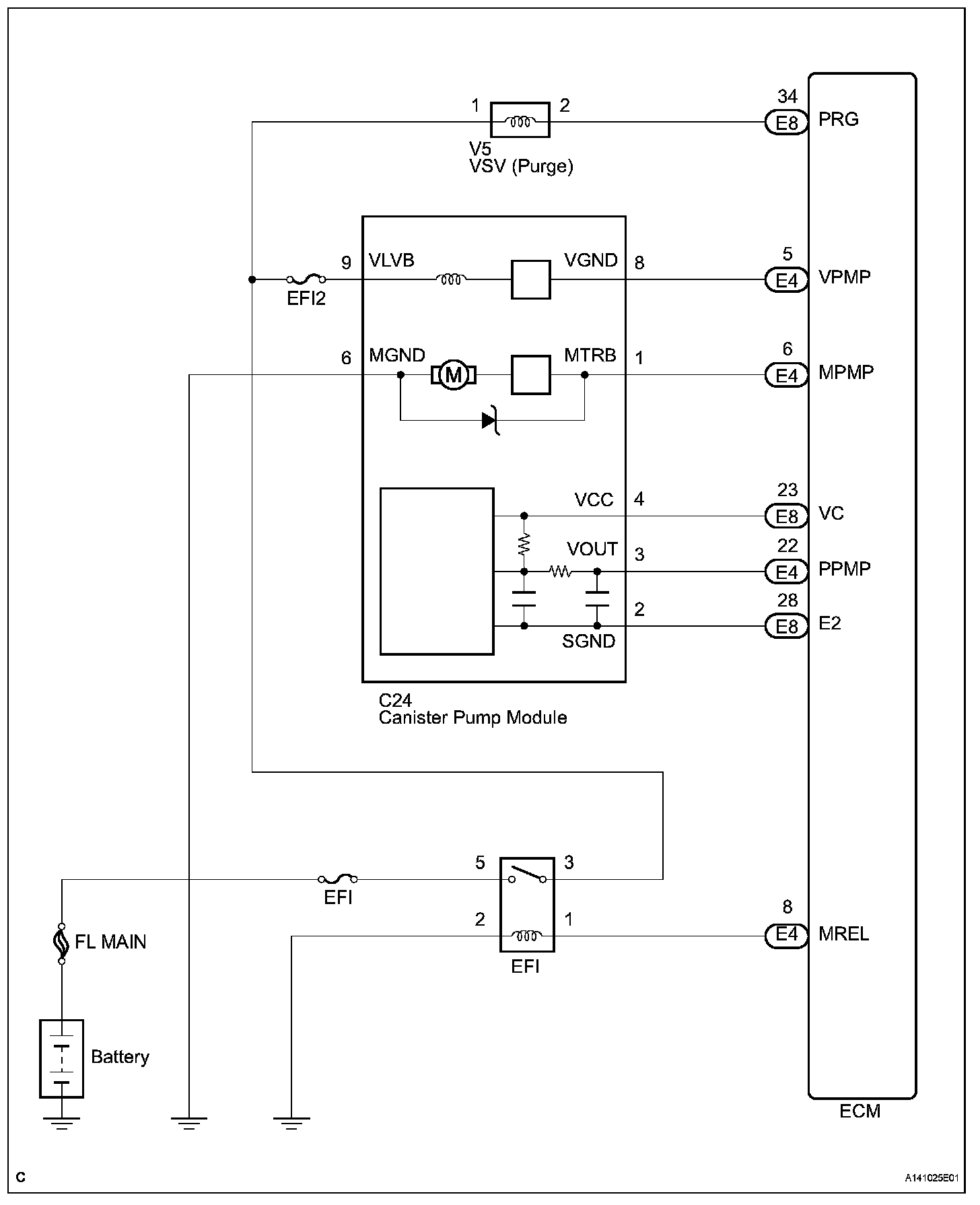 The electric vacuum pump creates negative pressure (vacuum) in the EVAP system, and the pressure is measured. Finally, the ECM monitors for leaks from the EVAP system and malfunctions in both the pump module and purge VSV, based on the EVAP pressure.