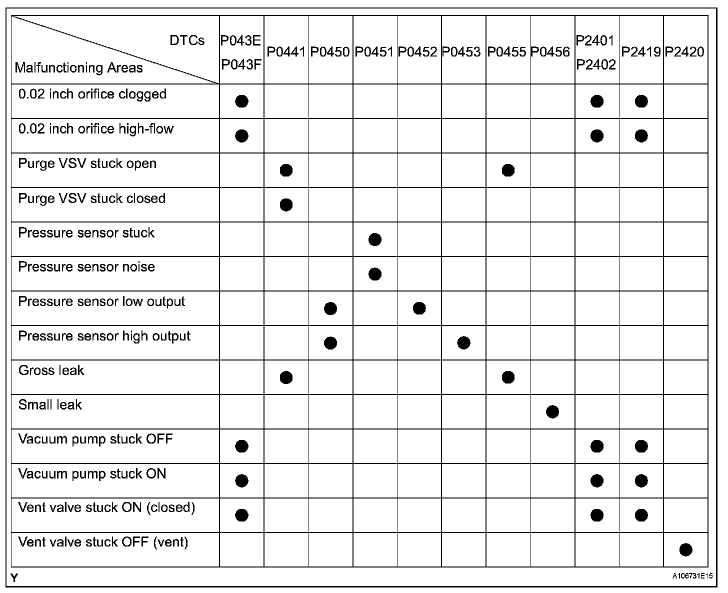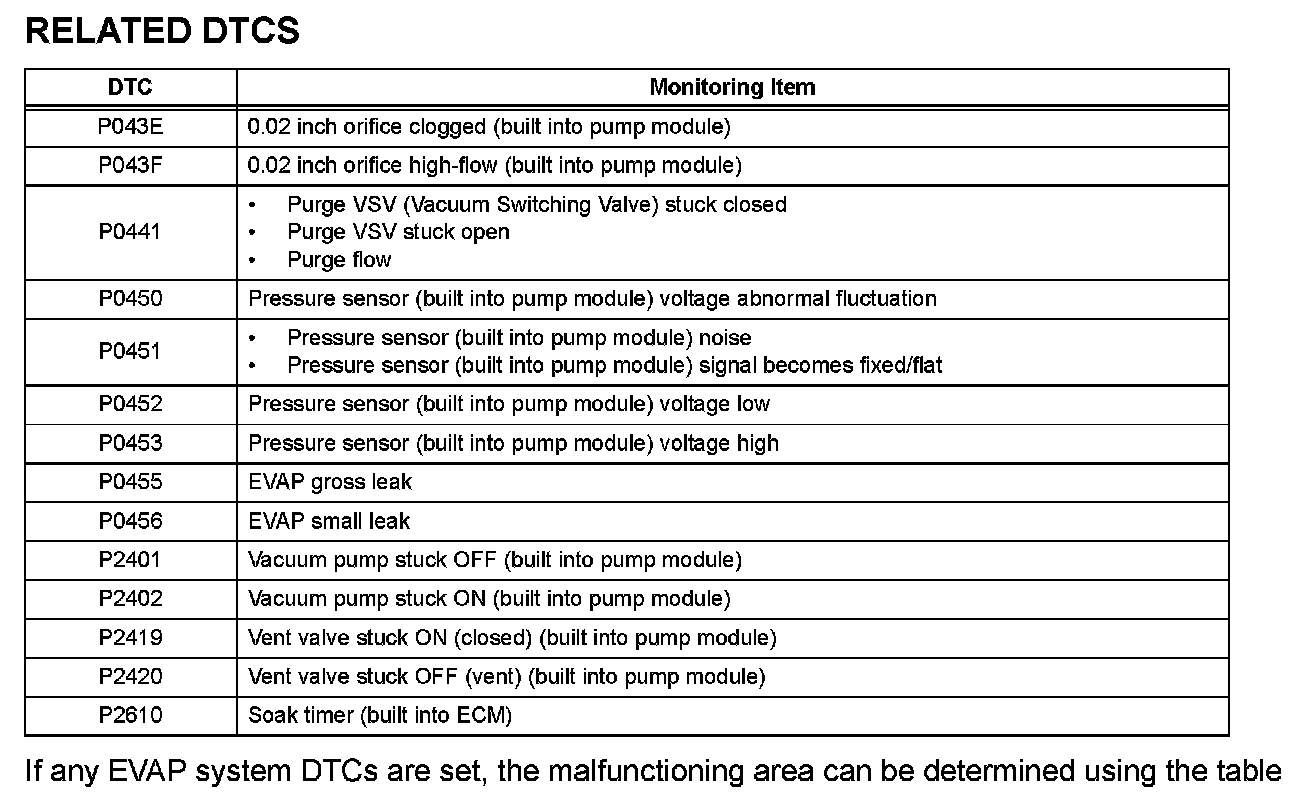 If any EVAP system DTCs are set, the malfunctioning area can be determined using the table.