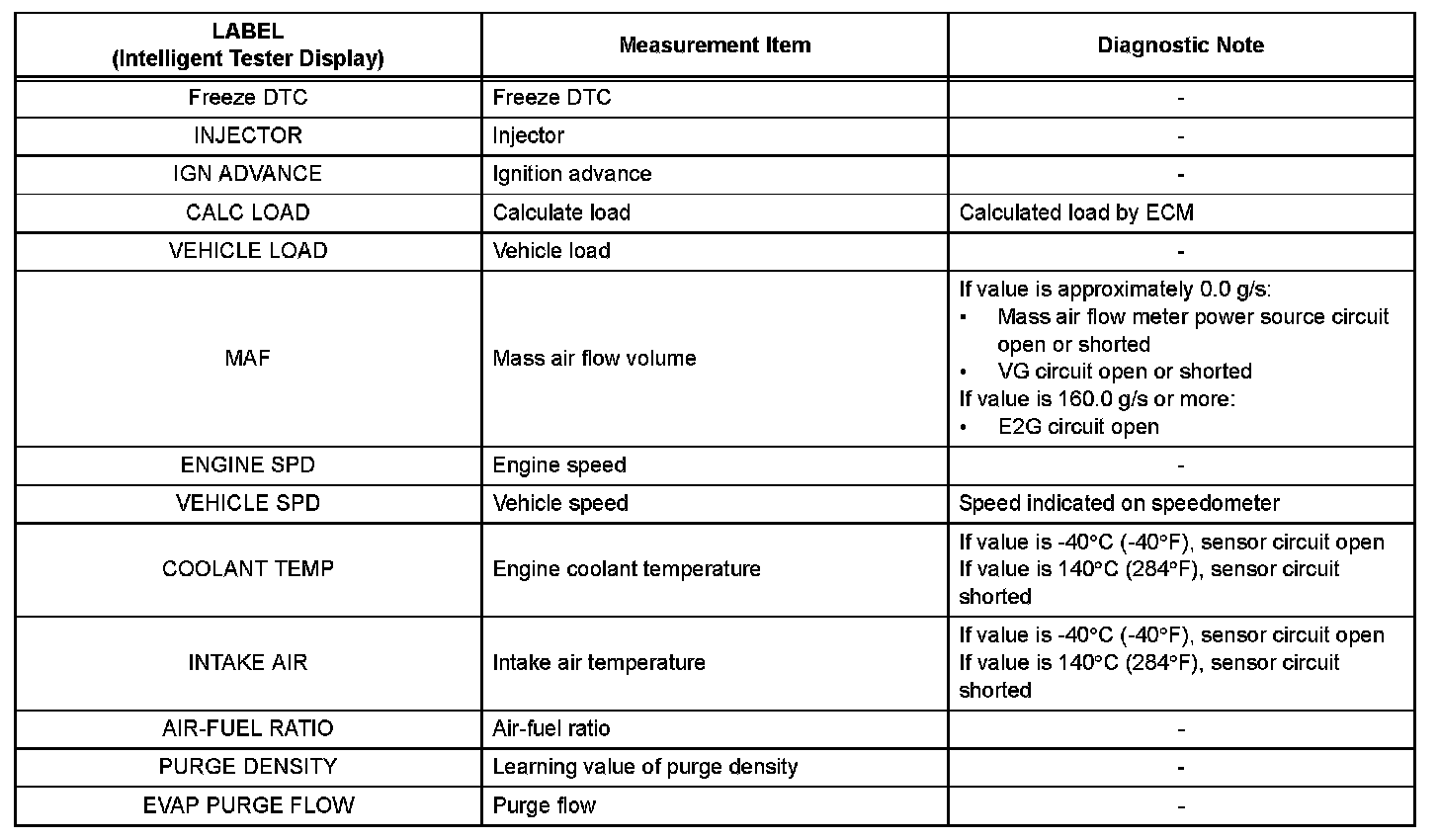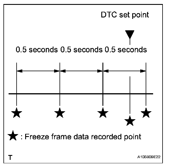 b. The ECM records engine conditions in the form of freeze frame data every 0.5 seconds. Using the intelligent tester, five separate sets of freeze frame data, including the data values at the time when the DTC was set, can be checked.