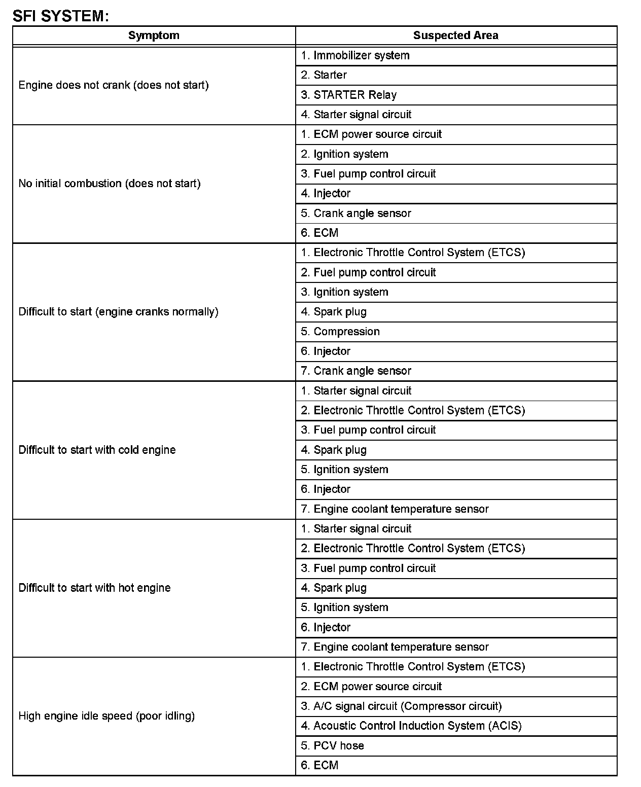 HINT: When a malfunction is not confirmed by a DTC (Diagnostic Trouble Code) check and the cause of problem cannot be identified through a basic inspection, troubleshoot according to the priority order indicated in the table.