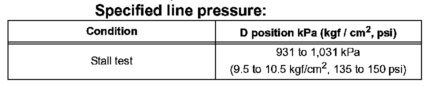 (11) Firmly depress the brake pedal, shift to the D position, depress the accelerator pedal all the way down and check the line pressure while the stall test is performed.