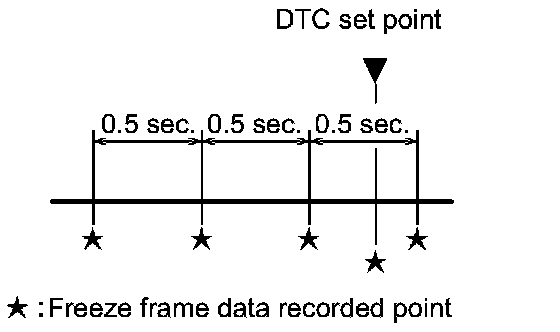 (h) The intelligent tester displays freeze frame data recorded at five different points: 1) 3 times before the DTC is set, 2) once when the DTC is set, and 3) once after the DTC is set. The data can be used to simulate the vehicle's condition around the time of the malfunction. The data may be helpful in determining the cause of a malfunction. It may also be helpful in determining whether a DTC is being caused by a temporary malfunction.