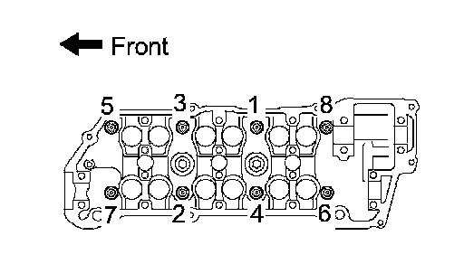 Uniformly install and tighten the 8 cylinder head bolts in the sequence shown in the illustration.