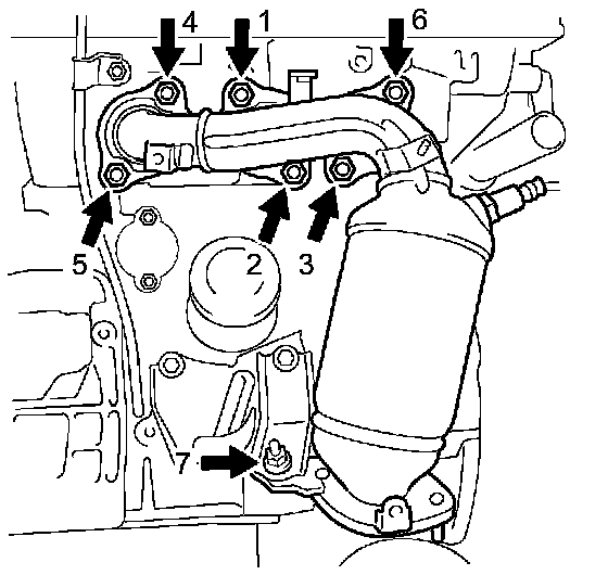 Install a new gasket and the converter with the 7 nuts. Uniformly, tighten the 7 nuts in the sequence shown in the illustration.