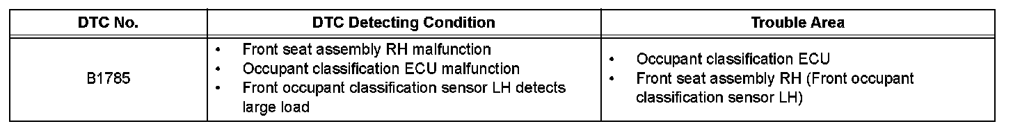 DTC B1785 is output when the occupant classification ECU receives a collision detection signal sent by the front occupant classification sensor LH when an