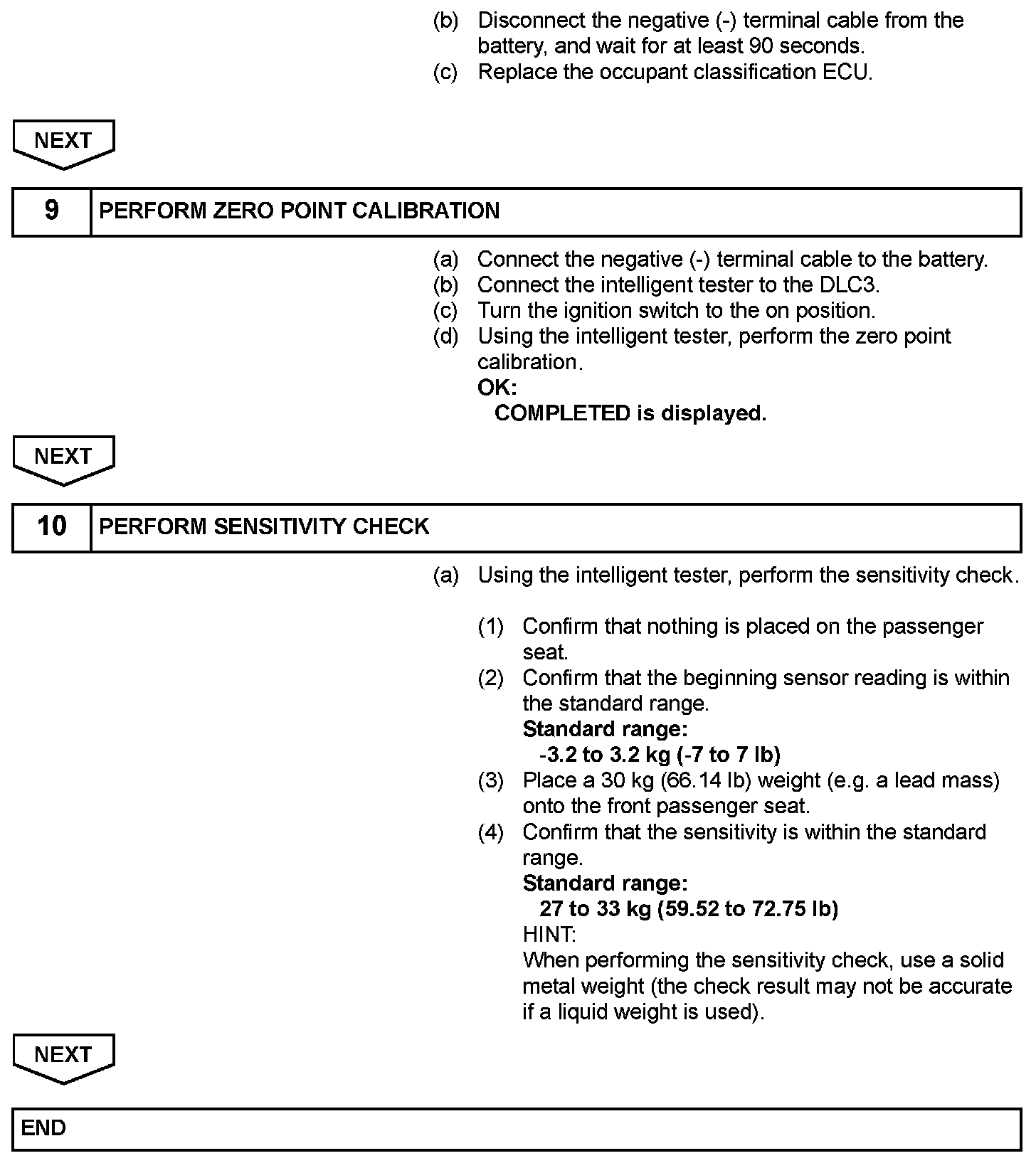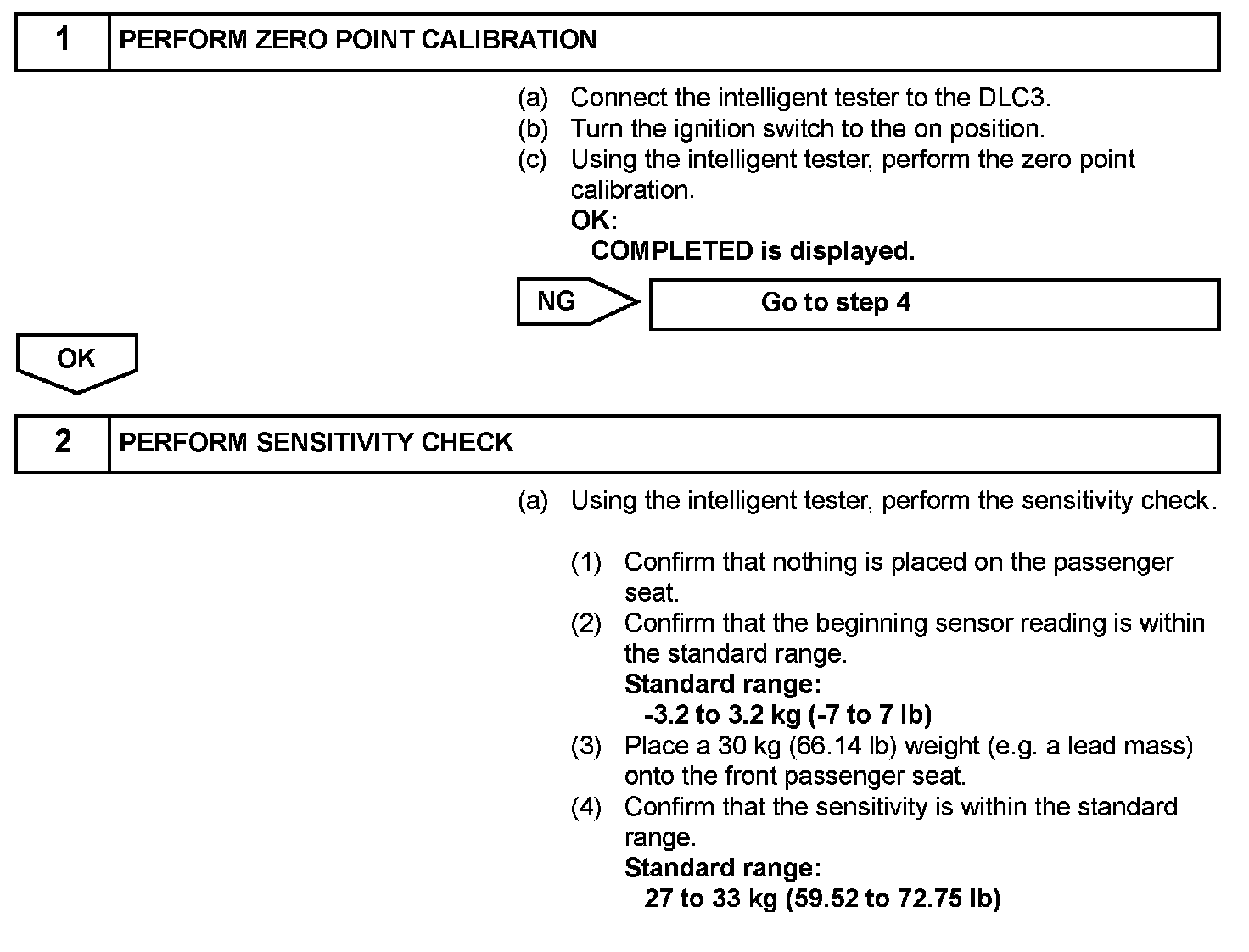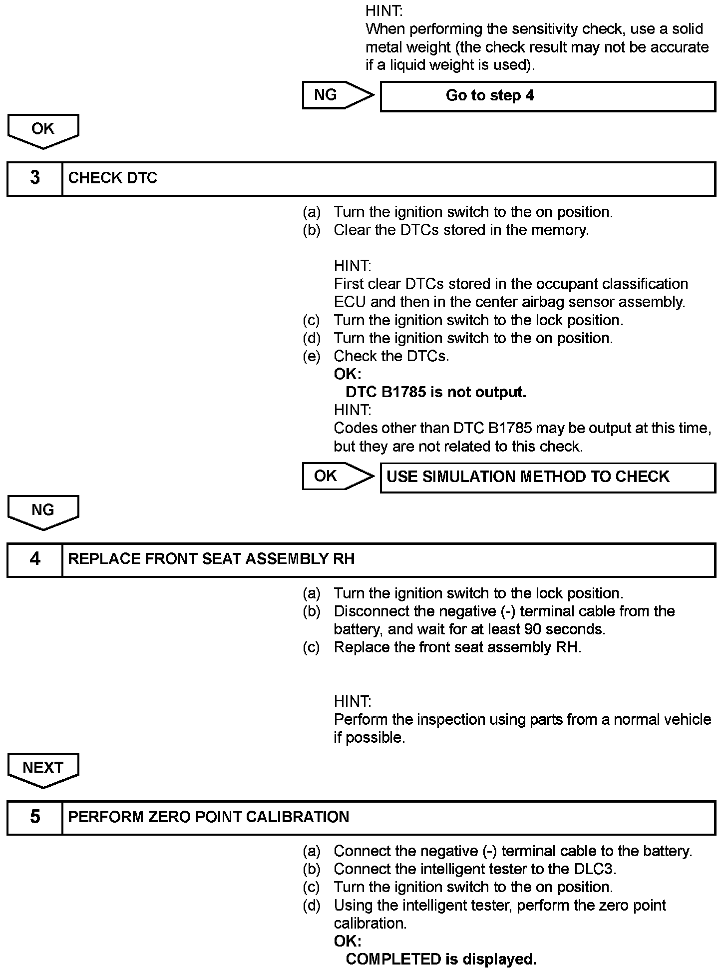 However when the front occupant classification sensor LH outputs a collision detection signal even if the vehicle is not in a collision DTC B1785 can be cleared by performing the zero point calibration and sensitivity check.