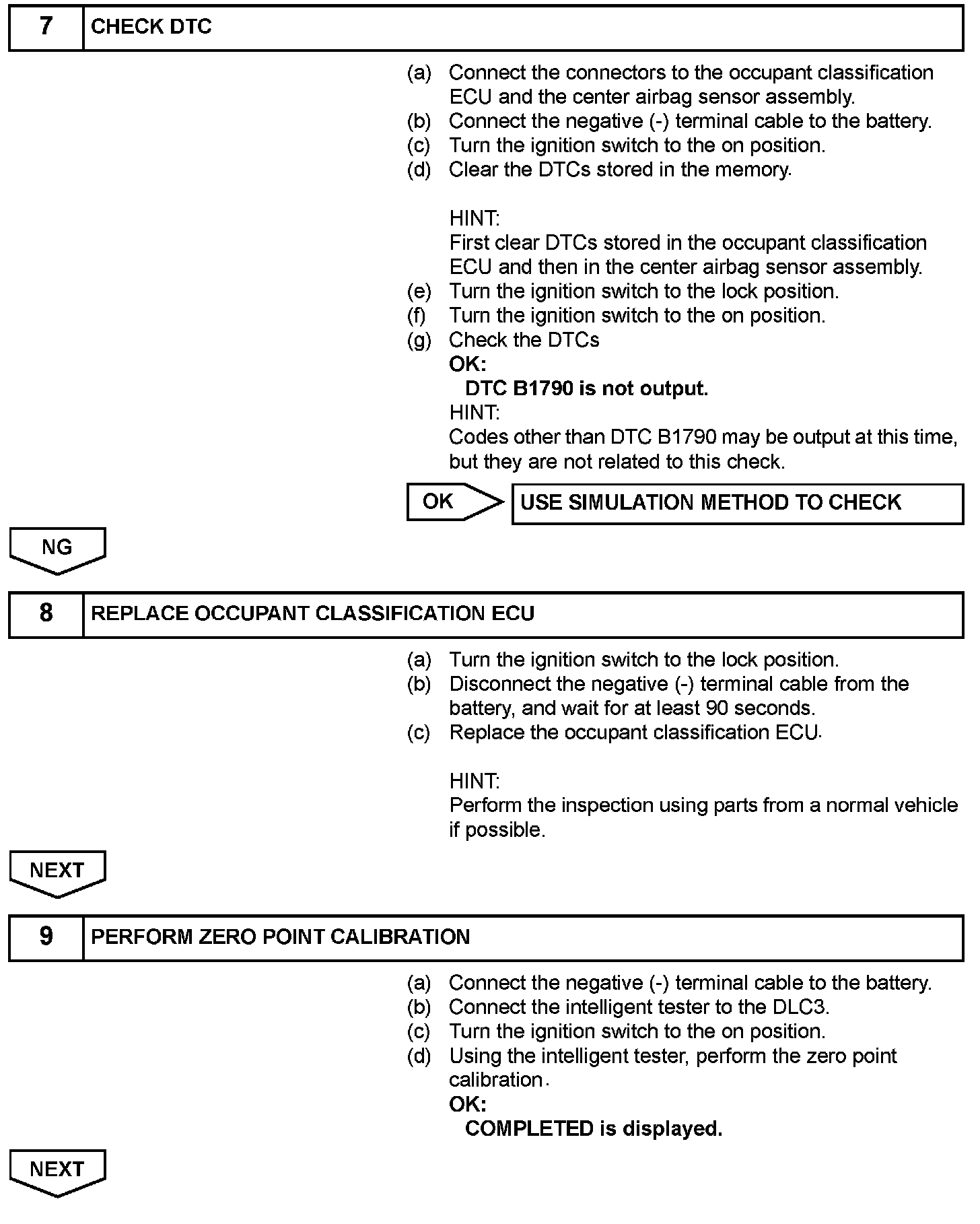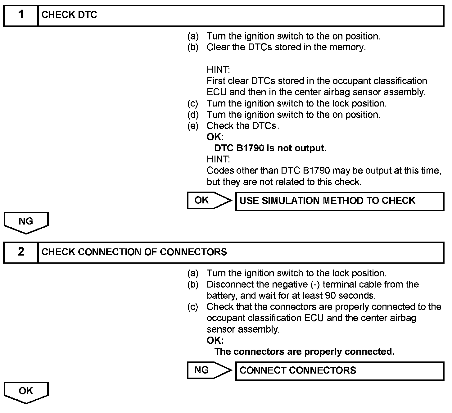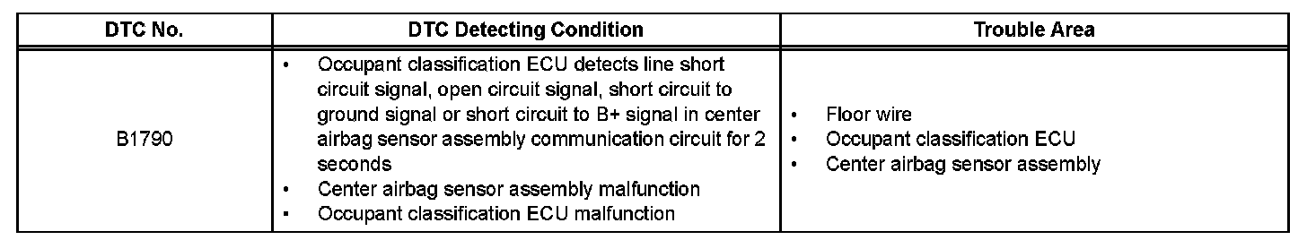 DTC B1790 is recorded when a malfunction is detected in the center airbag sensor assembly communication circuit.