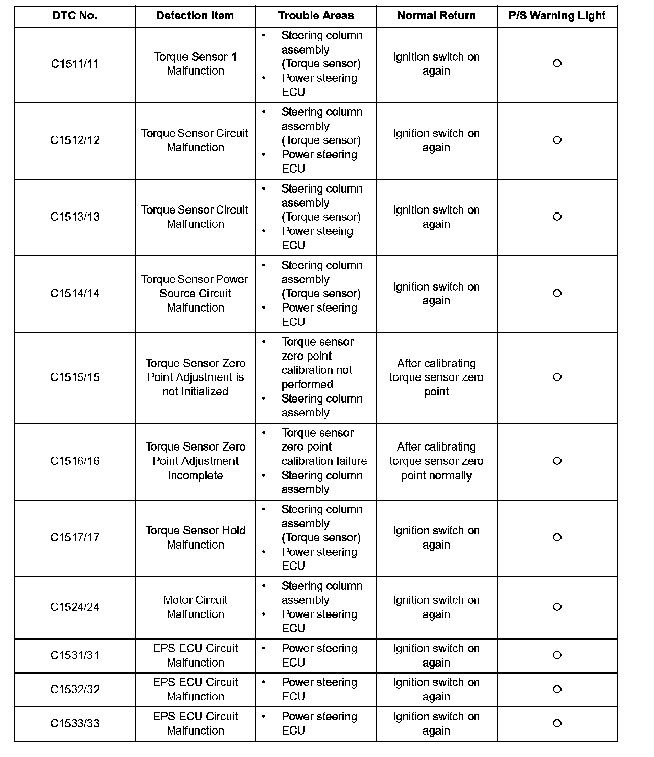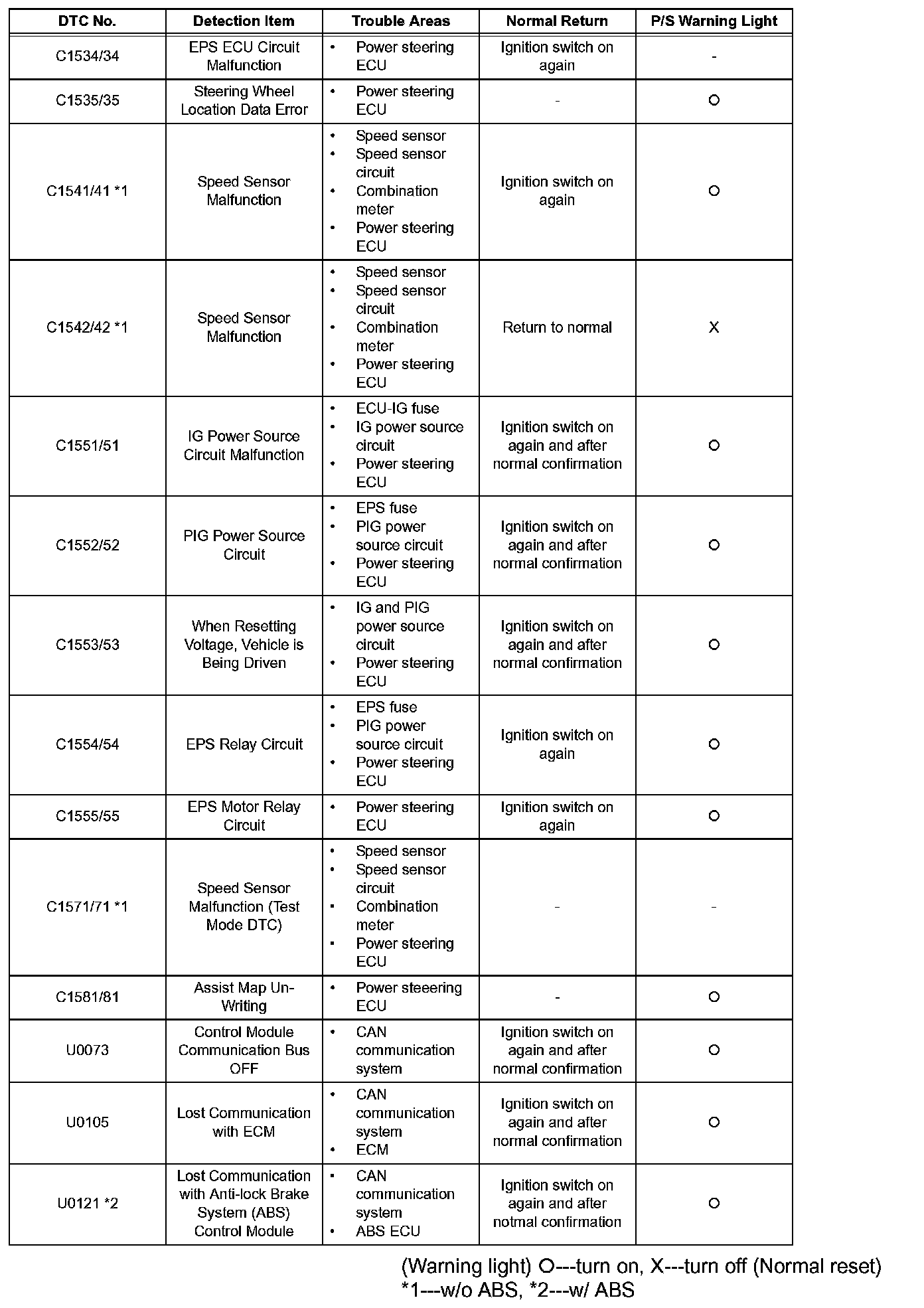 ^ The P/S warning light remains illuminated during test mode and starts blinking when the speed sensor is determined to be normal.
