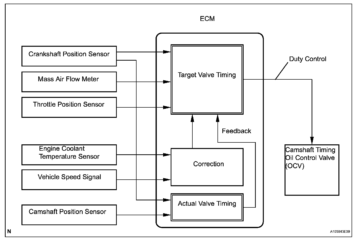 The VVT system includes the ECM, Oil Control Valve (OCV) and VVT controller. The ECM sends a target duty-cycle control signal to the OCV. This control signal regulates the oil pressure supplied to the VVT controller. Camshaft timing control is performed according to engine operating conditions such as the intake air volume, throttle valve position and engine coolant temperature. The ECM controls the OCV, based on the signals transmitted by several sensors. The VVT controller regulates the intake camshaft angle using oil pressure through the OCV. As a result, the relative positions of the camshaft and crankshaft are optimized, the engine torque and fuel economy improve, and the exhaust emissions decrease under overall driving conditions. The ECM detects the actual intake valve timing using signals from the camshaft and crankshaft position sensors, and performs feedback control. This is how the target intake valve timing is verified by the ECM.