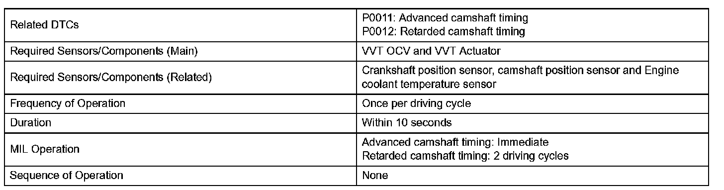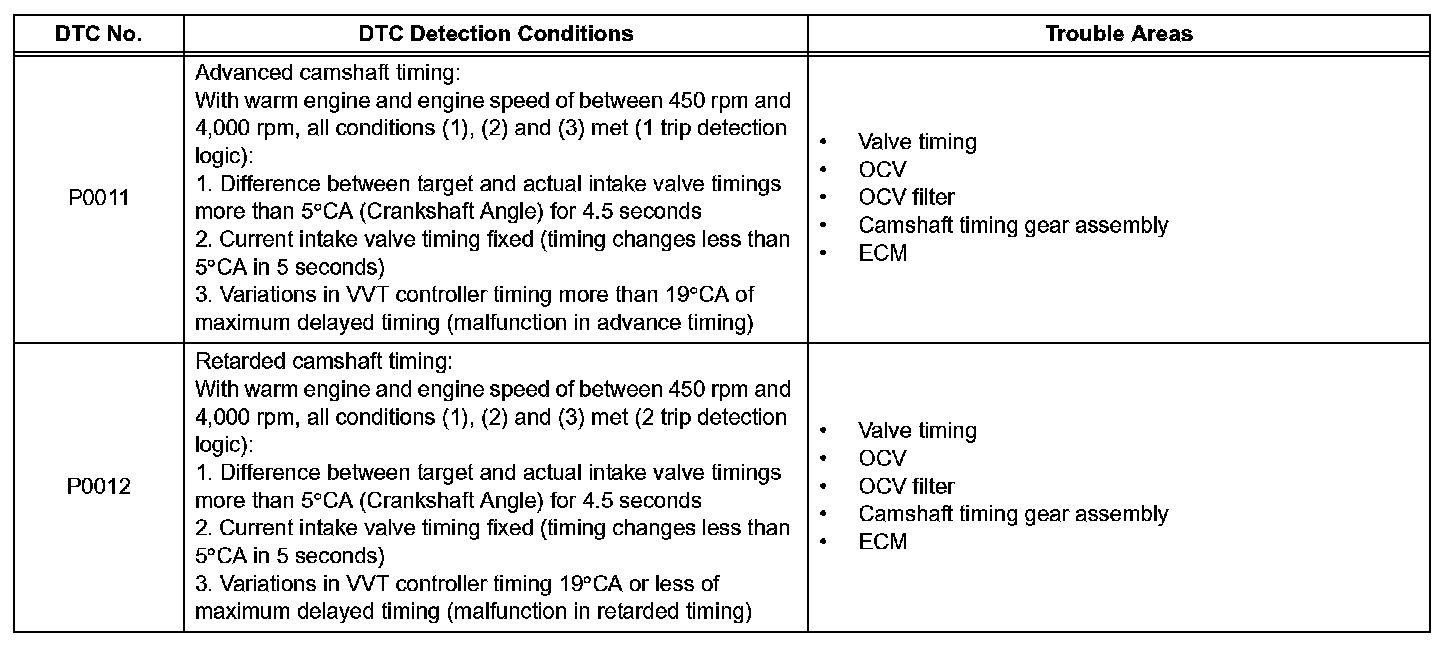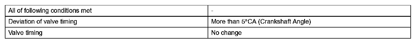 1. The difference between the target and actual intake valve timing is more than 5 °CA (Crankshaft Angle) and the condition continues for more than 4.5 seconds.