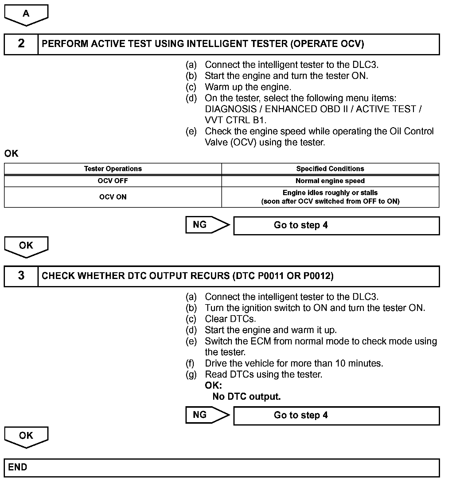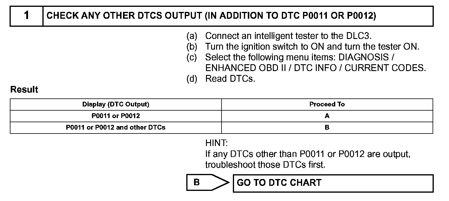 HINT: If DTC P0011 or P0012 is present, check the VVT (Variable Valve Timing) system.