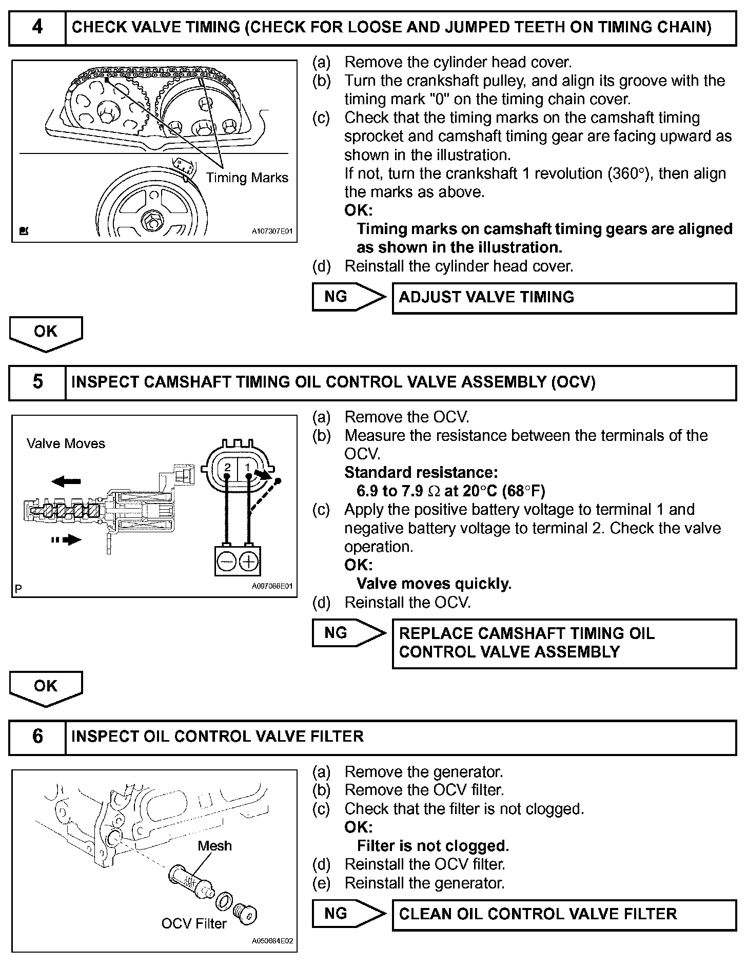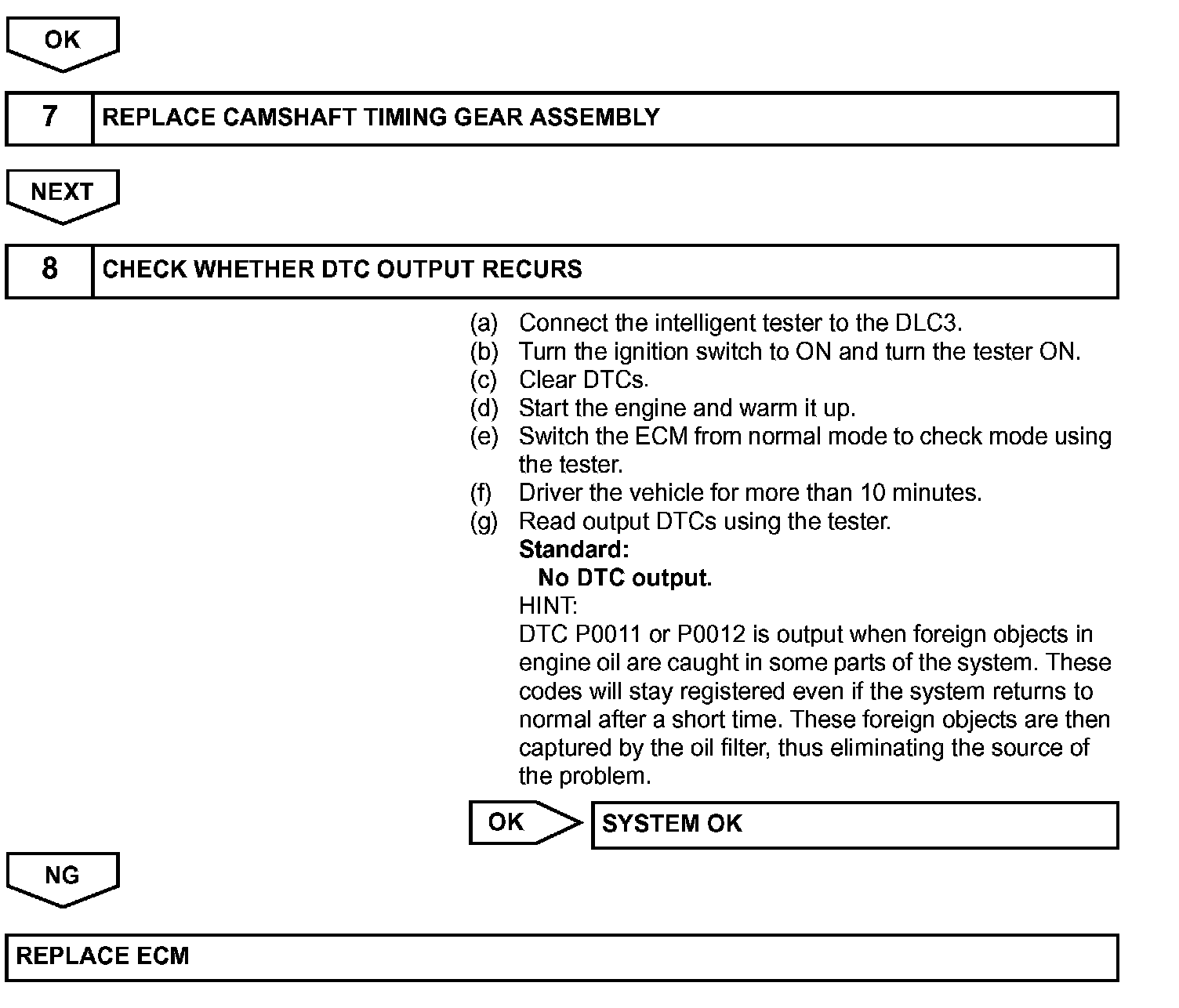 NOTE: DTC P0011 or P0012 may be set when foreign objects in the engine oil are caught in some parts of the system. The DTC will remain set even if the system returns to normal after a short time. Foreign objects are filtered out by the oil filter.