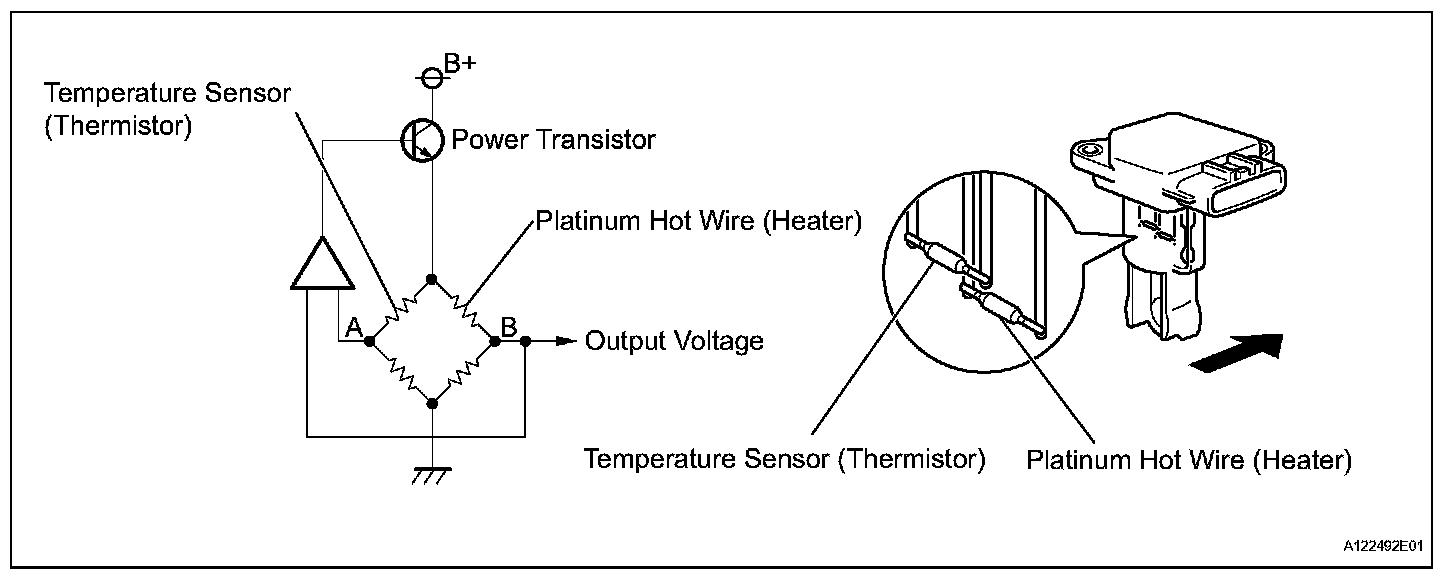 Inside the MAF meter, there is a heated platinum wire which is exposed to the flow of intake air. By applying a specific electrical current to the wire, the ECM heats it to a given temperature. The flow of incoming air cools both the wire and an internal thermistor, affecting their resistance. To maintain a constant current value, the ECM varies the voltage applied to these components in the MAF meter. The voltage level is proportional to the airflow through the sensor, and the ECM uses it to calculate the intake air volume.