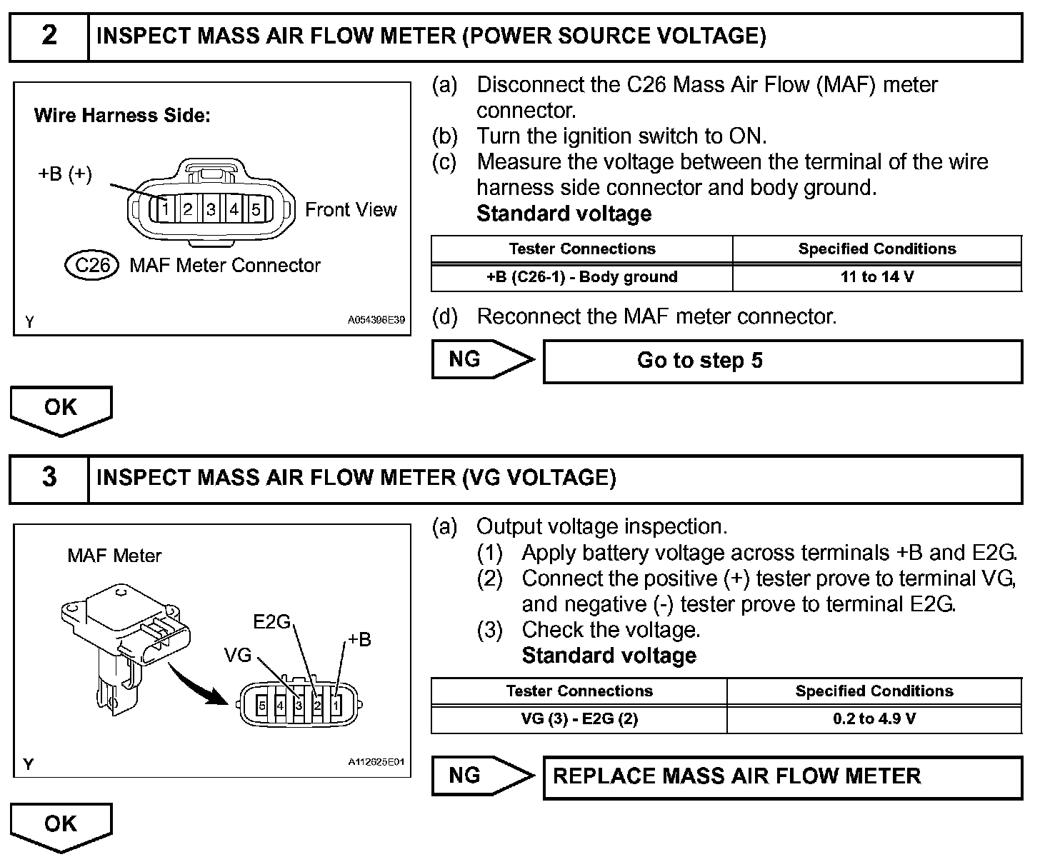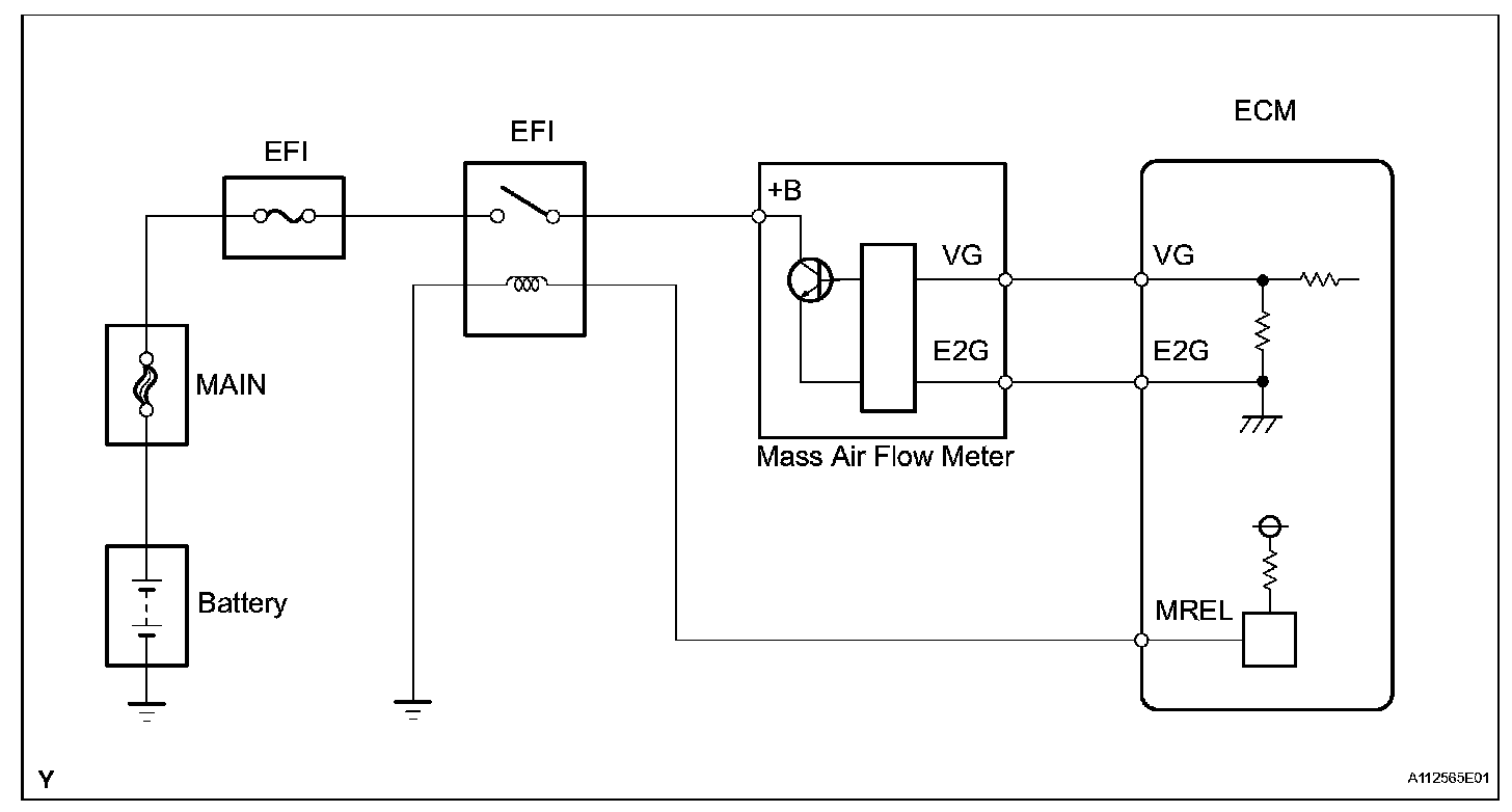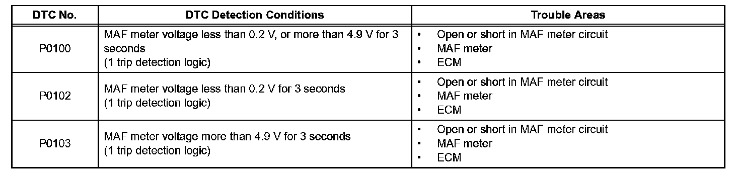 If there is a defect in the MAF meter or an open or short circuit, the voltage level deviates from the normal operating range. The ECM interprets this deviation as a malfunction in the MAF meter and sets a DTC.