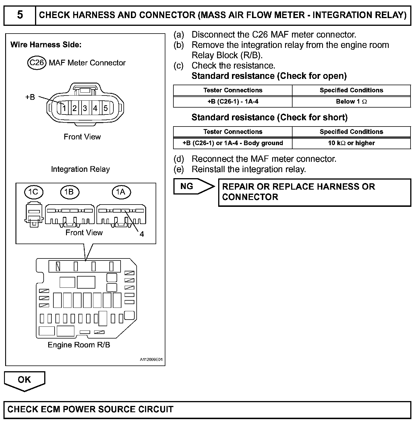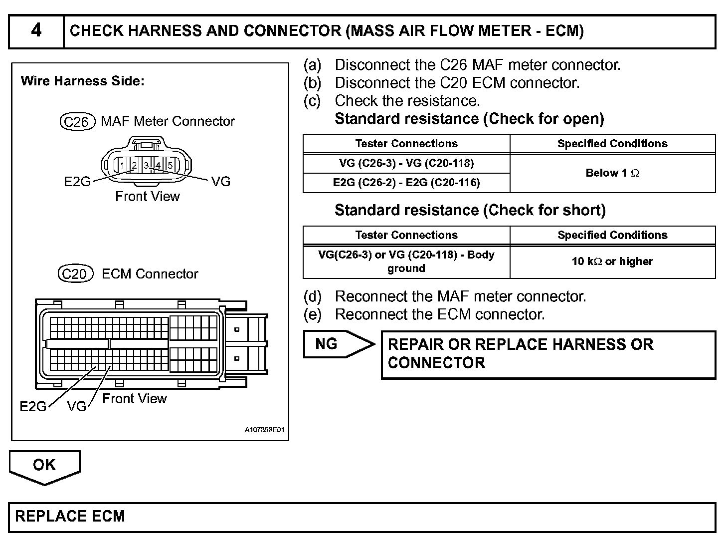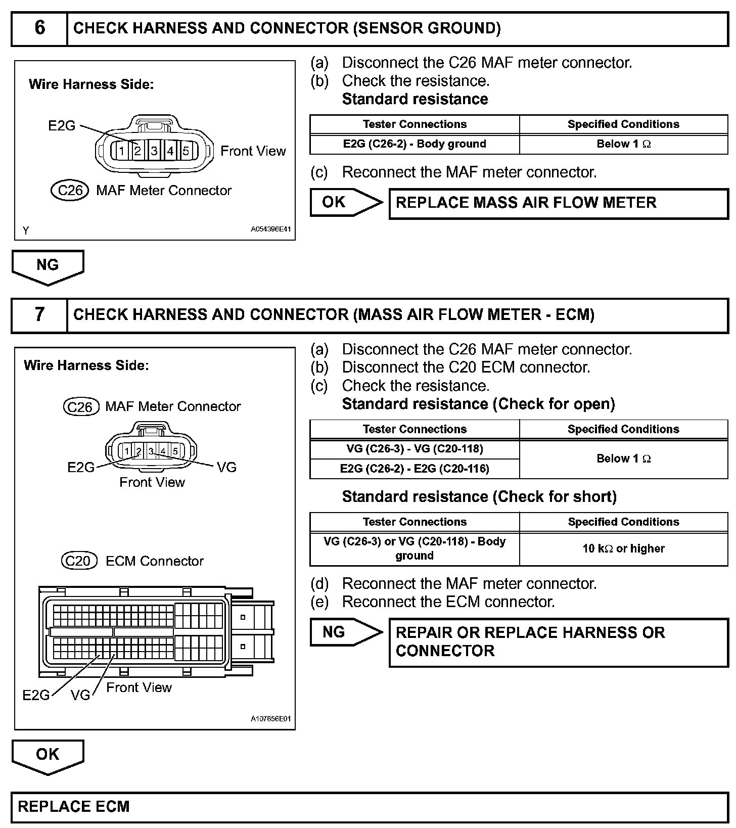 If there is a defect in the MAF meter or an open or short circuit, the voltage level deviates from the normal operating range. The ECM interprets this deviation as a malfunction in the MAF meter and sets a DTC.