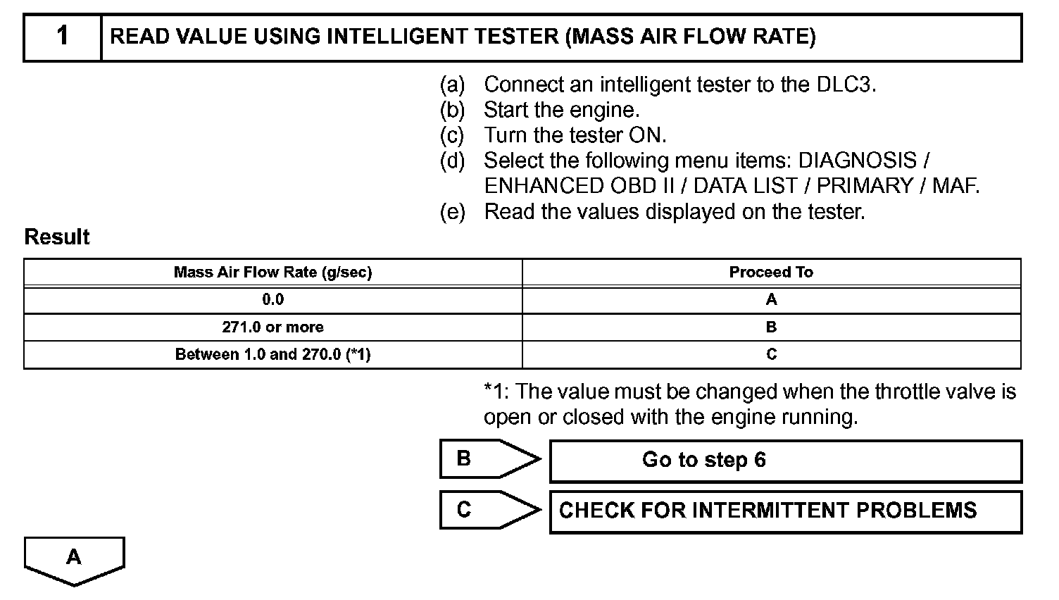 HINT: When any of these DTCs are set, check the air-flow rate by selecting the given menu items on an intelligent tester: DIAGNOSIS / ENHANCED OBD II / DATA LIST / PRIMARY / MAF.