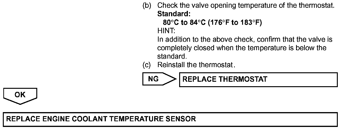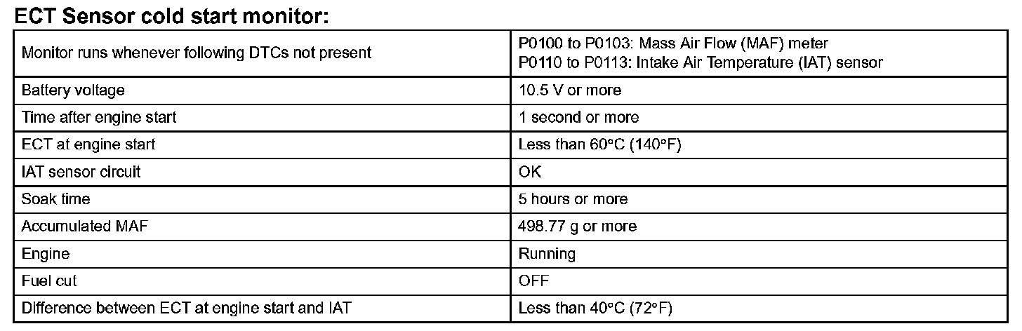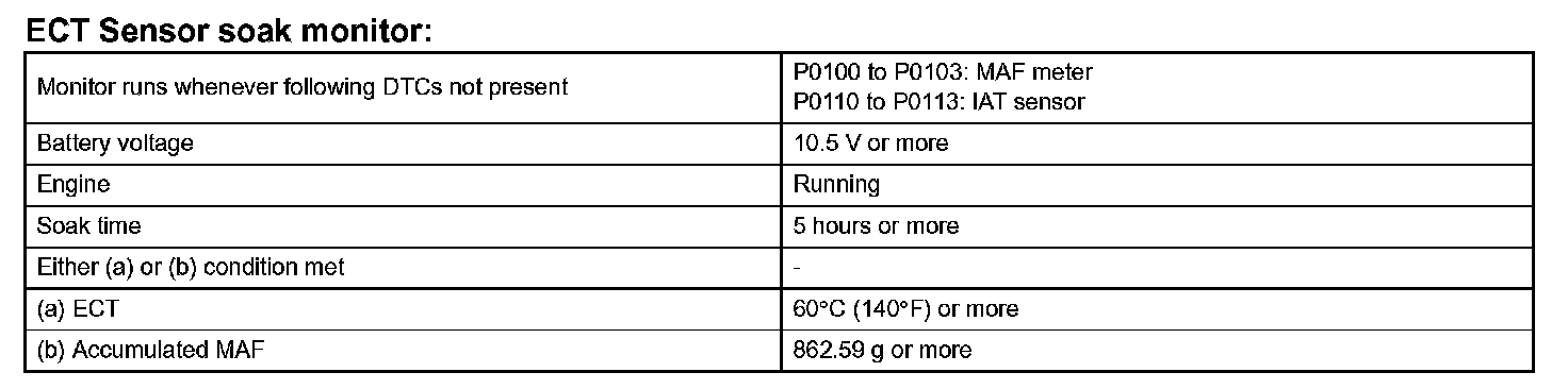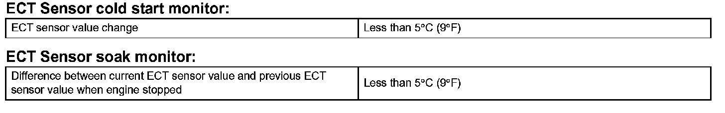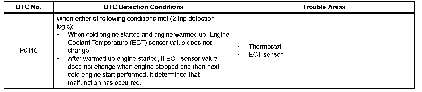 When a cold engine start is performed and then the engine is warmed up, if the ECT sensor value does not change, it is determined that a malfunction has occurred. If this is detected in 2 consecutive driving cycles, the MIL is illuminated and a DTC is set.