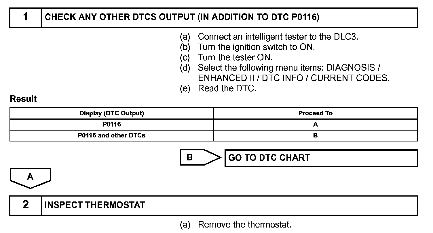 - If any of DTCs P0115, P0117, P0118 or P0125 are set simultaneously with DTC P0116, sensor may have an open or a short circuit. Troubleshoot those DTCs first.