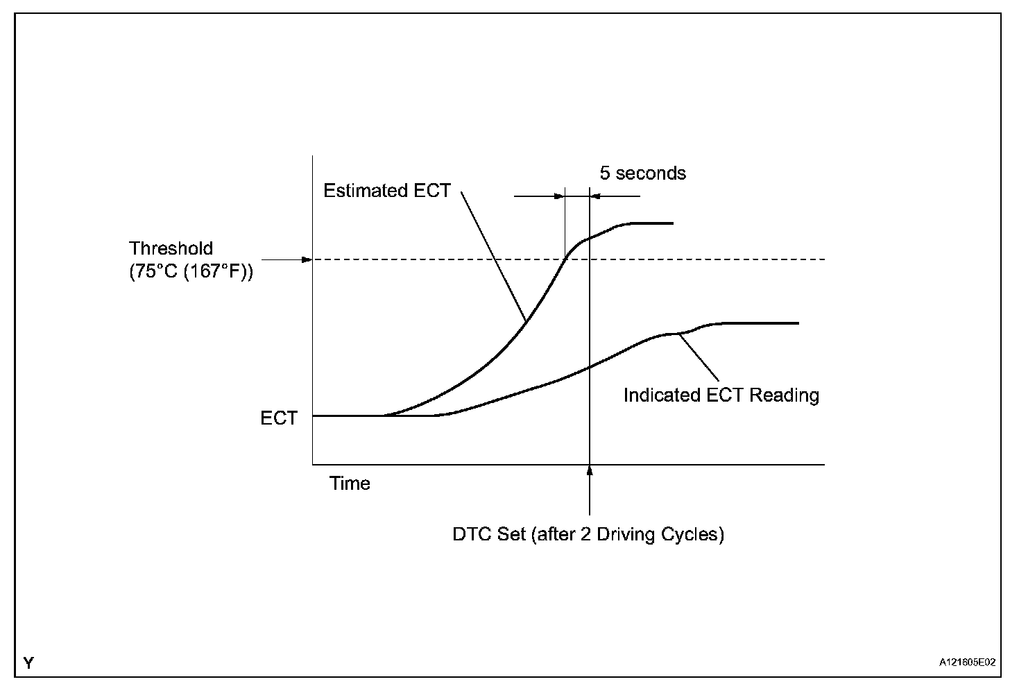 This DTC is set when the Engine Coolant Temperature (ECT) does not reach 75 °C (167 °F) despite sufficient engine warm-up time having elapsed.