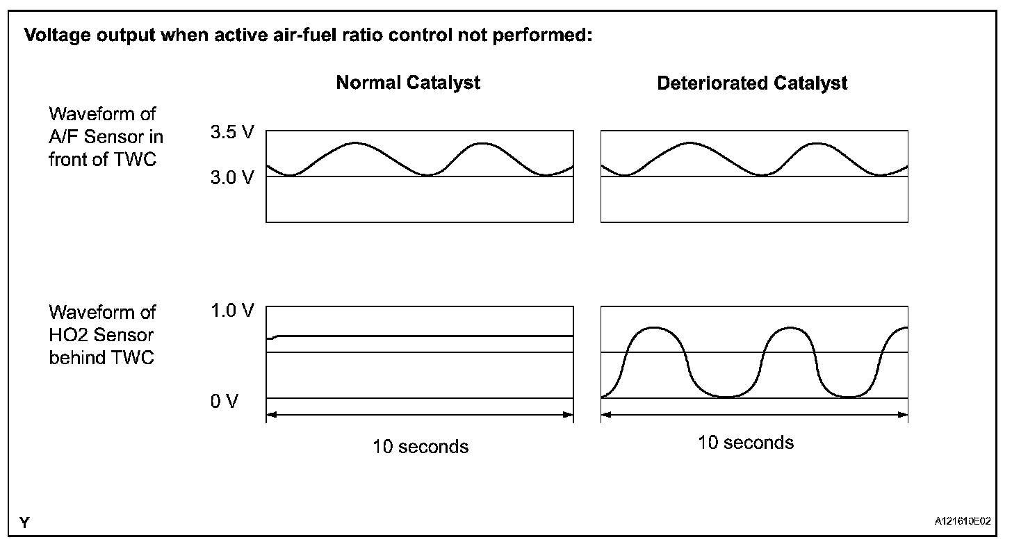 - If the Three-Way Catalytic Converter (TWC) has deteriorated, the HO2 sensor (located behind the TWC) voltage output fluctuates up and down frequently, even under normal driving conditions (active air-fuel ratio control is not performed).