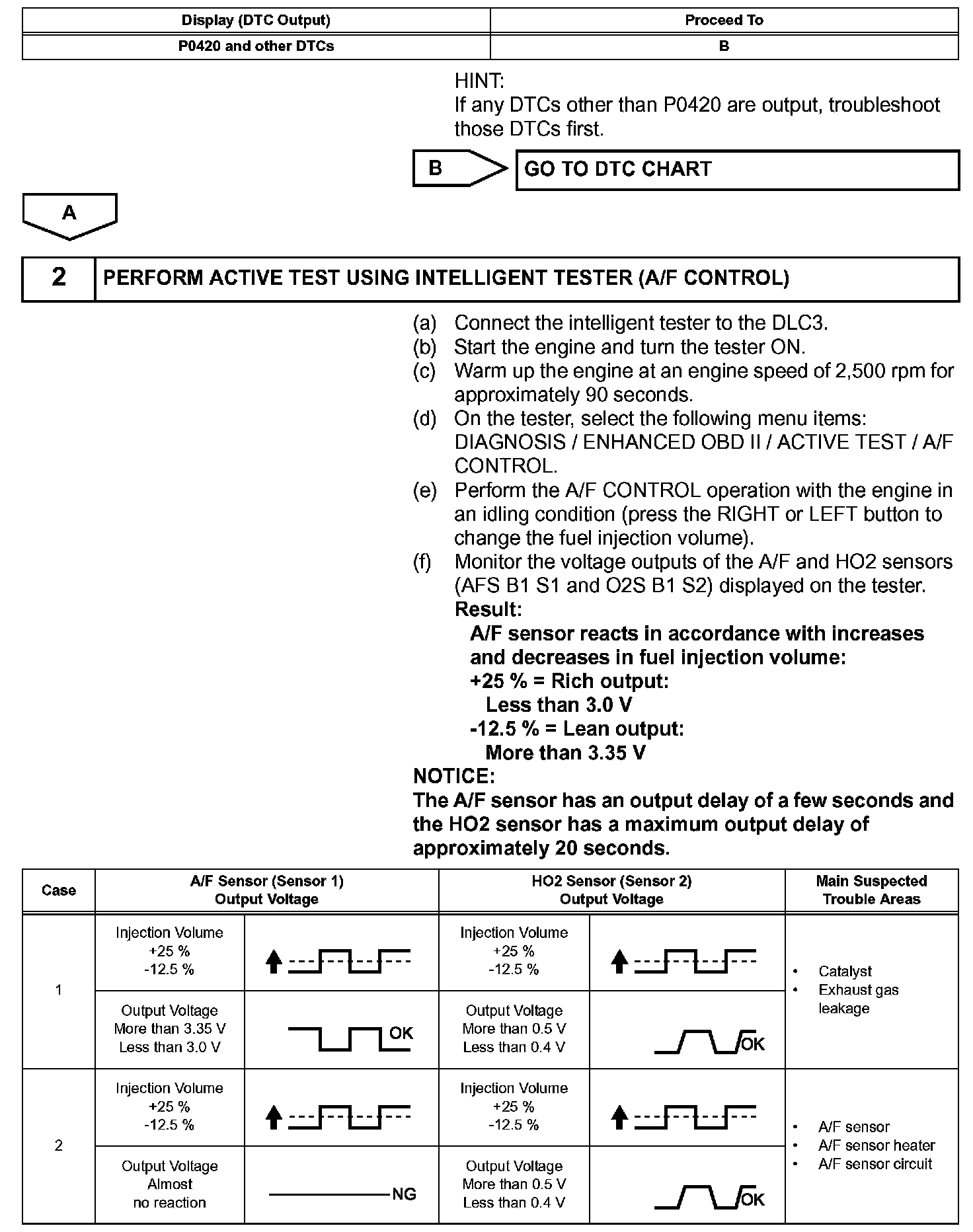- If either voltage output of the Air-Fuel Ratio (A/F) or Heated Oxygen (HO2) sensor does not fluctuate, or there is a noise in the waveform of either sensor the sensor may be malfunctioning.