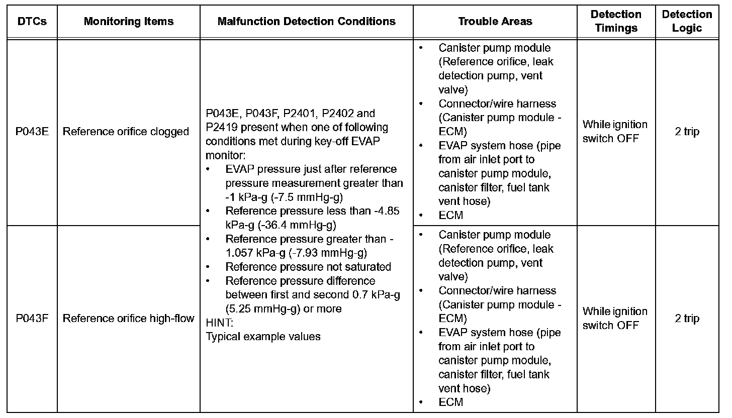 DTC P043E Evaporative Emission System Reference Orifice Clog UpDTC P043F Evaporative Emission System Reference Orifice High Flow