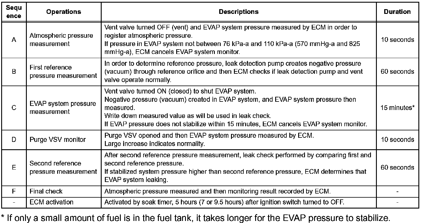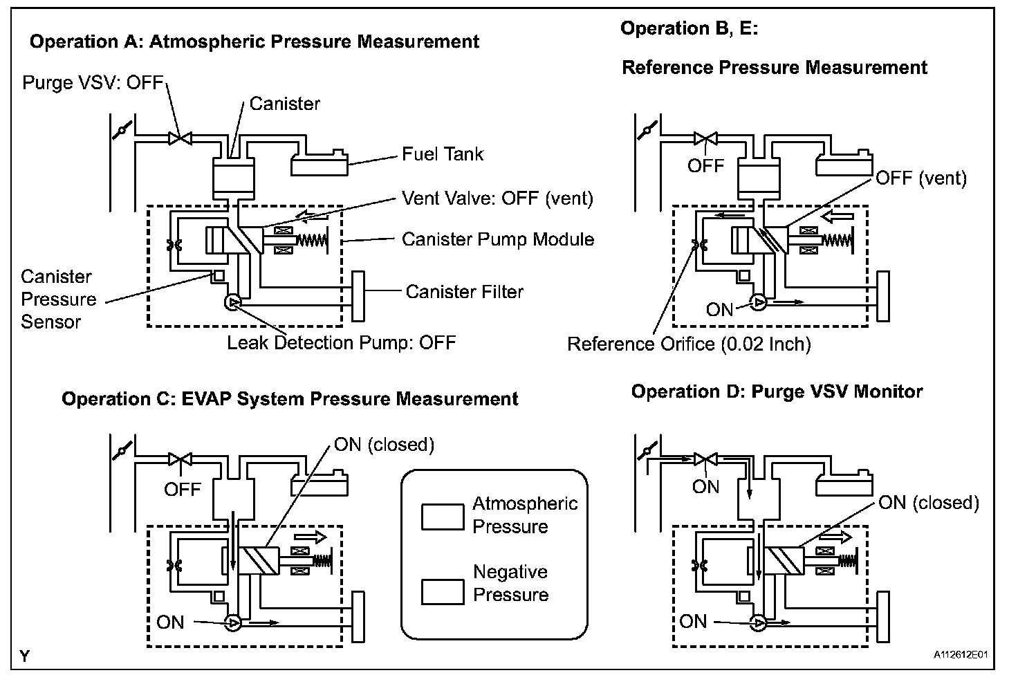 The leak detection pump creates negative pressure (vacuum) in the EVAP system and the pressure is measured. Finally, the ECM monitors for leaks from the EVAP system, and malfunctions in both the canister pump module and purge VSV, based on the EVAP pressure.