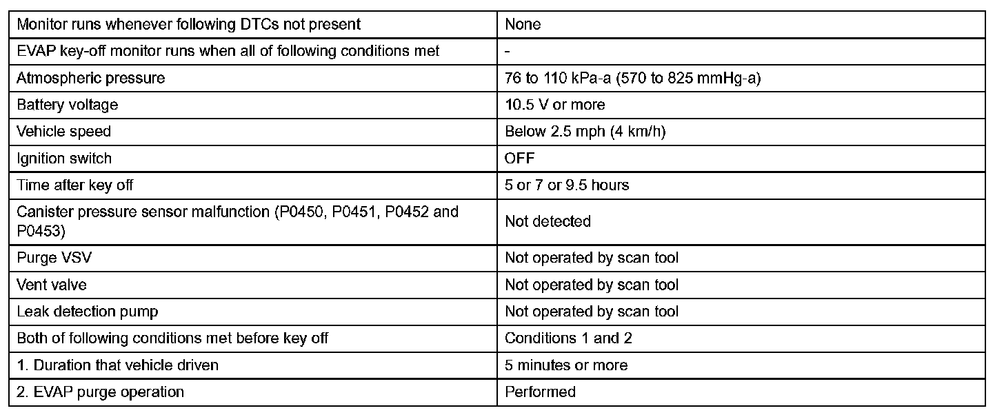 This monitor checks for EVAP (Evaporative Emission) system leaks and canister pump module malfunctions. The monitor starts 5 hours. after the ignition switch is turned to OFF. At least 5 hours are required for the fuel to cool down to stabilize the EVAP pressure, thus making the EVAP system monitor more accurate.