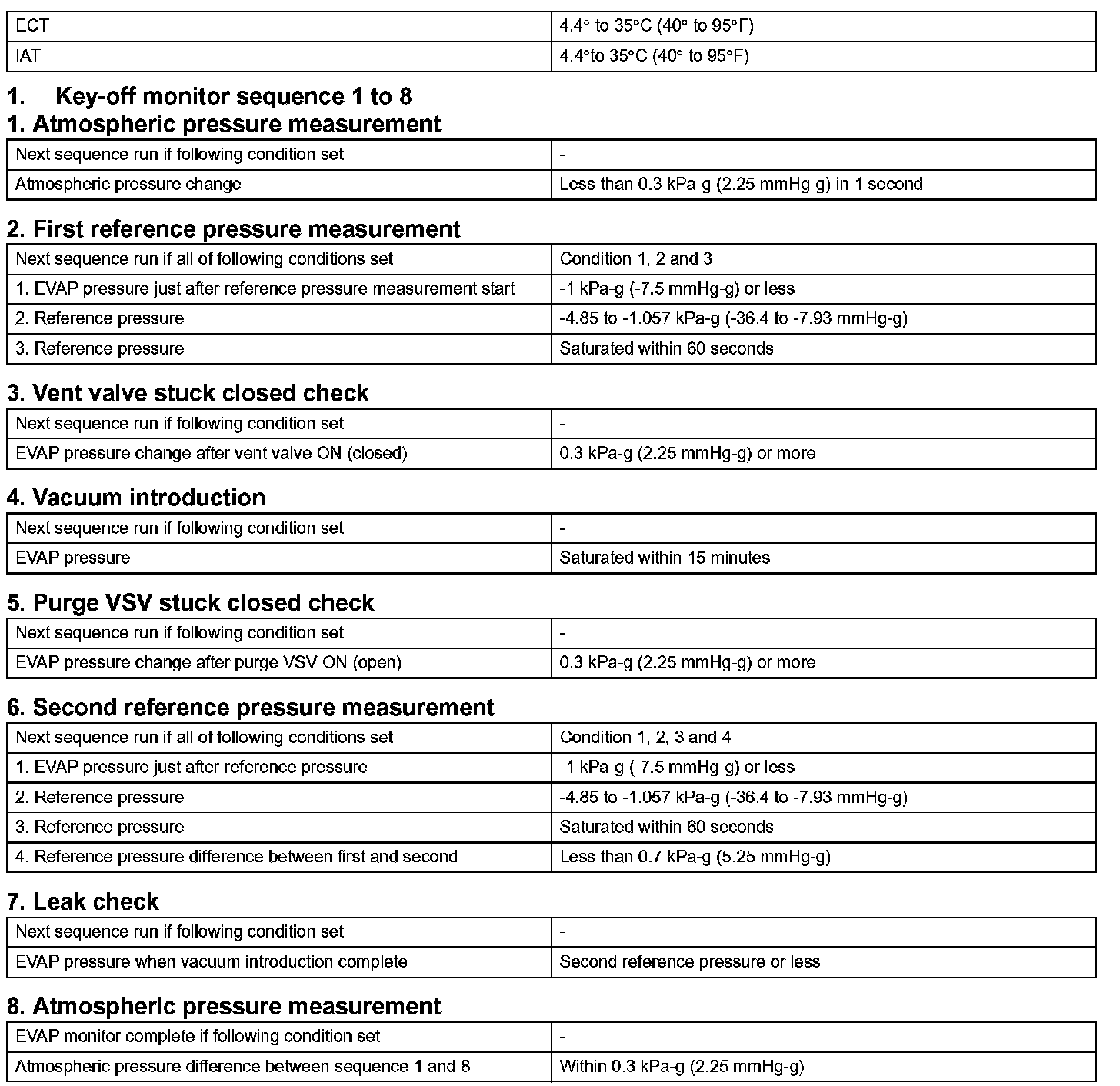 The vent valve is turned OFF (open) and the EVAP pressure is measured. If the variation in the pressure is less than 0.5 kPa-g (3.75 mm Hg-g), the ECM interprets this as the purge VSV being stuck closed, and illuminates the MIL and sets DTC P0441 (2 trip detection logic).