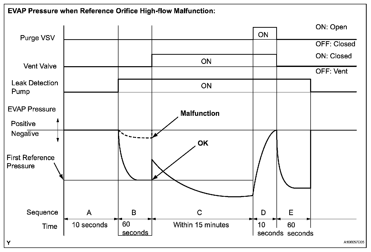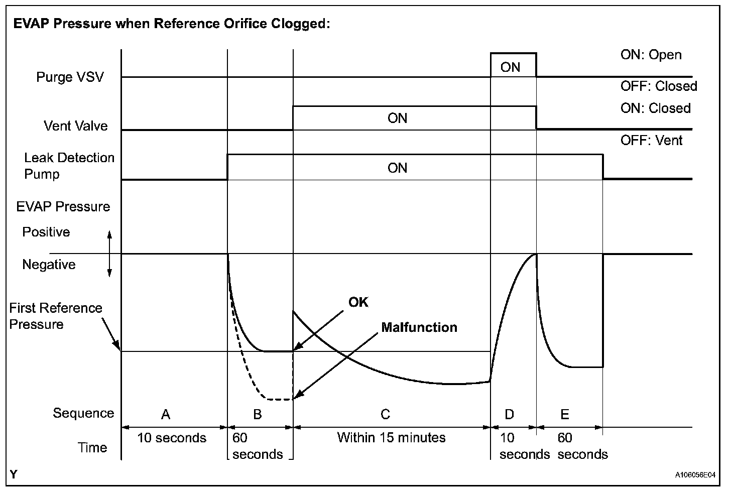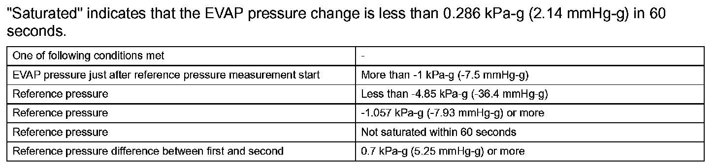 In operation B, the leak detection pump creates negative pressure (vacuum) through the reference orifice. The EVAP system pressure is then measured by the ECM, using the canister pressure sensor, to determine the reference pressure. If the pressure is lower than -4.85 kPa-g (-36.4 mmHg-g), the ECM interprets this as a clog malfunction in the reference orifice, and stops the EVAP system monitor. The ECM then illuminates the MIL and sets the DTC (2 trip detection logic).