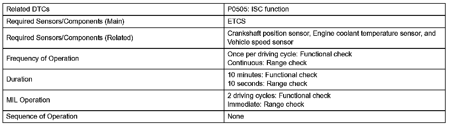 The ECM monitors the idling speed and idling air flow volume to conduct Idle Speed Control (ISC). The ECM determines that the ISC system is malfunctioning if the following conditions apply: