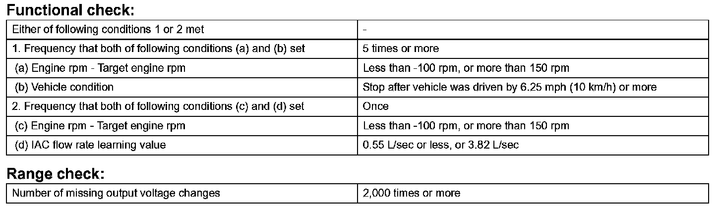 - After driving at 6.25 mph (10 km/h) or more, the actual engine idling speed varies from the target idling speed by between 100 rpm and 200 rpm, 5 times or more during a drive cycle.