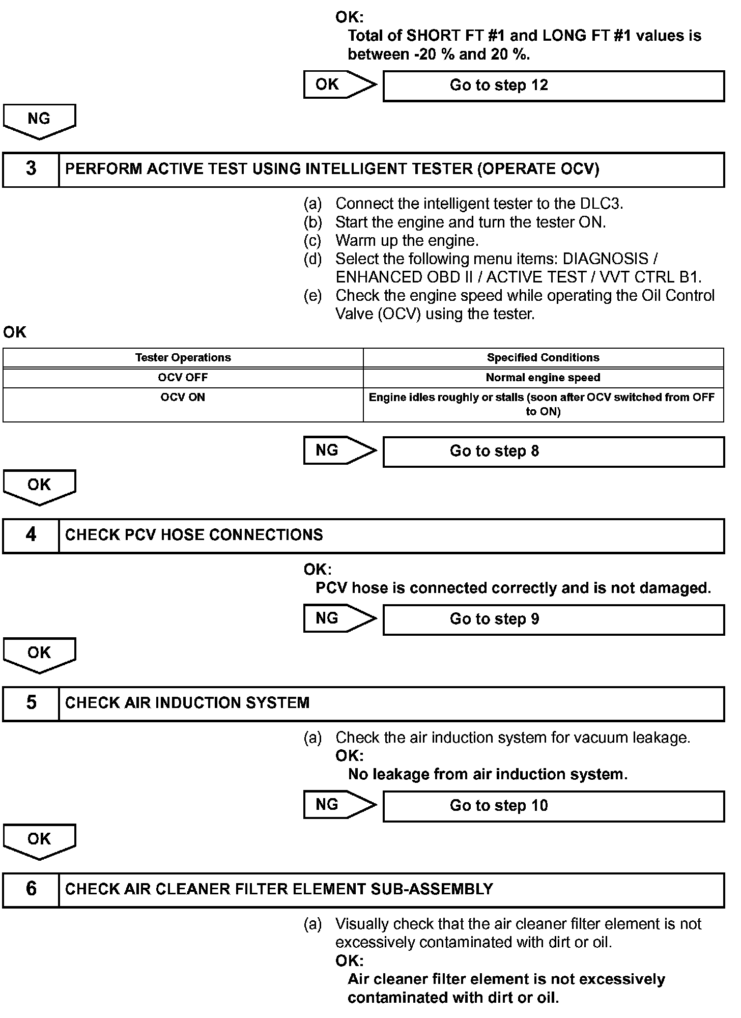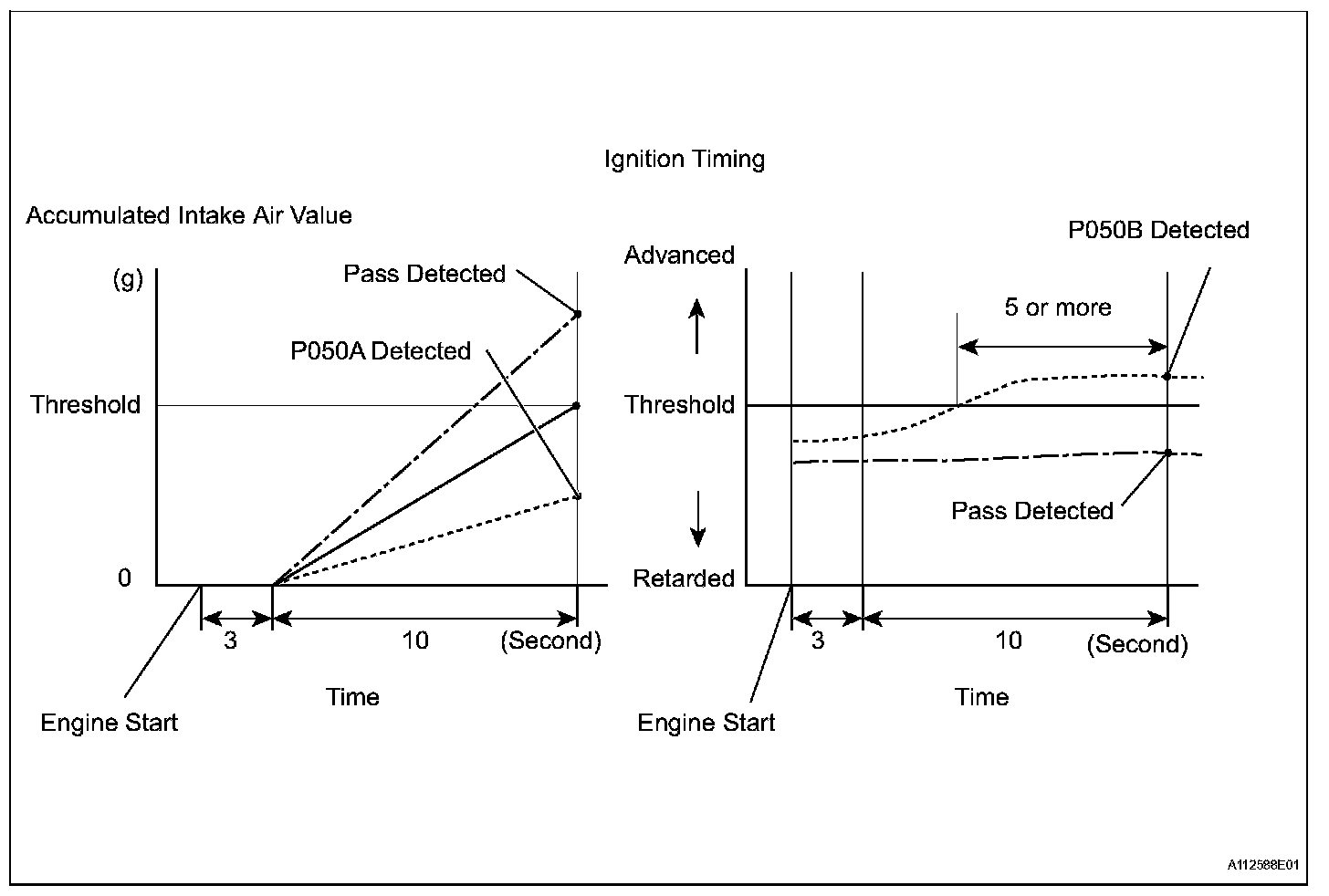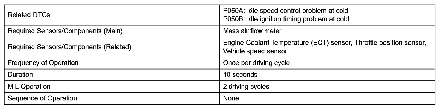 The ECM monitors the intake air amount during idling and the ignition timing. When the Engine Coolant Temperature (ECT) is between -10 °C and 50 °C (14 °F and 122 °F), the ECM calculates the idling intake air amount for 10 seconds, beginning 3 seconds after the engine starts. When the accumulated value is the threshold, the ECM interprets this as a malfunction in the Idle Speed Control (ISC) system at cold start.