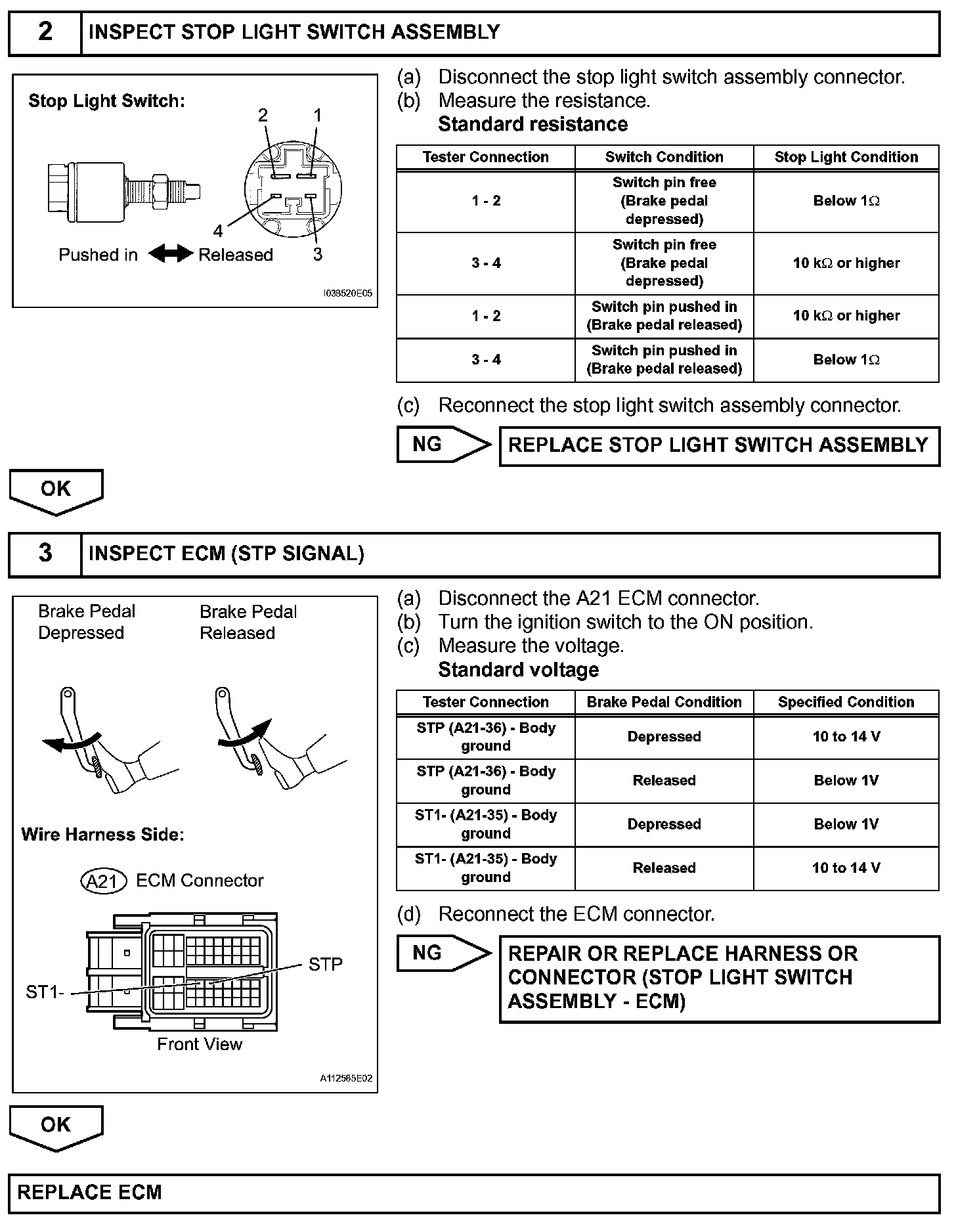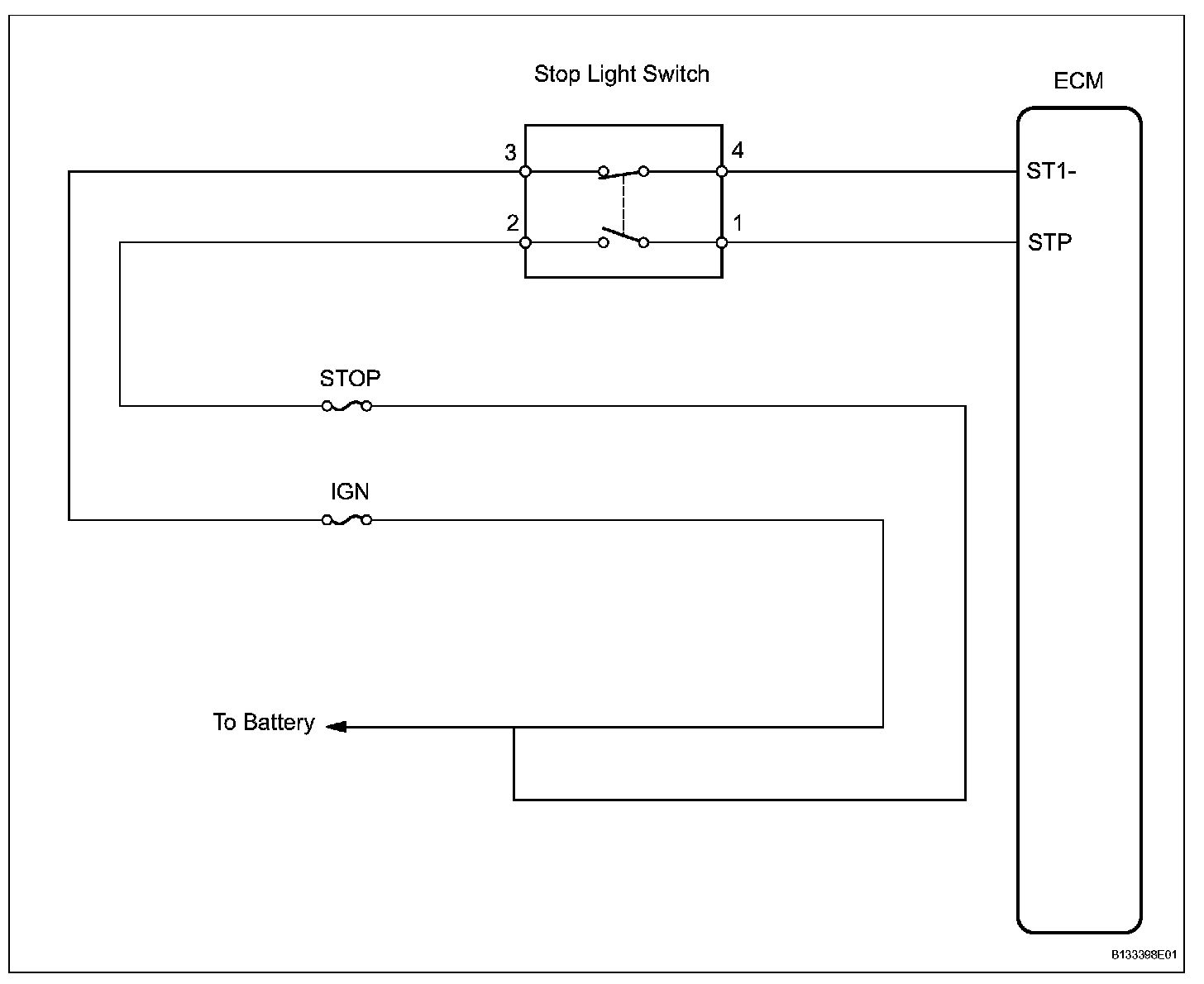 The cruise control system cancels cruising when the ECM detects that the brake pedal is depressed during cruise control driving. The stop light switch assembly sends signals to the ECM according to the brake pedal conditions. When the brake pedal is released, terminal ST1- is the positive (+) battery voltage, and terminal STP voltage is below 1 V. While the brake pedal is depressed, terminal ST1- is below 1 V, and STP is positive (+) battery voltage. During braking, the ECM cancels cruise control as one of the manual cancel functions.