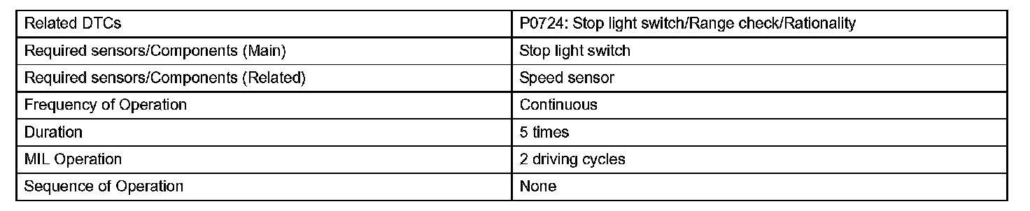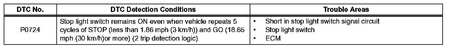 This DTC indicates that the stop light switch remains ON. When the stop light switch remains ON during "stop and go" driving, the ECM interprets this as a fault in the stop light switch and the MIL comes on and the ECM stores the DTC. The vehicle must stop (less than 1.86 mph (3 km/h)) and go (18.65 mph (30 km/ h) or more) 5 times during 2 driving cycles, in order to detect a malfunction.