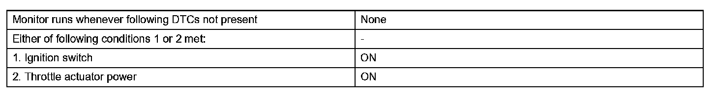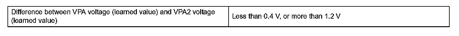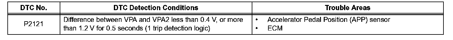 When the difference between the output voltages of VPA and VPA2 deviates from the standard, the ECM determines that the Accelerator Pedal Position (APP) sensor is malfunctioning. The ECM turns on the MIL and the DTC is set.