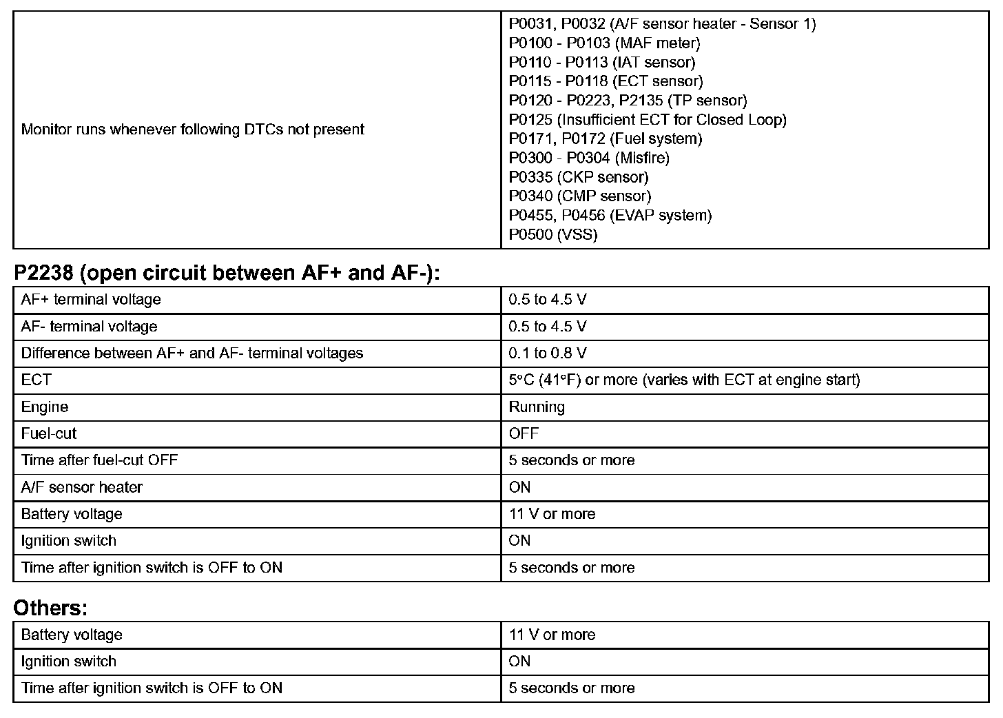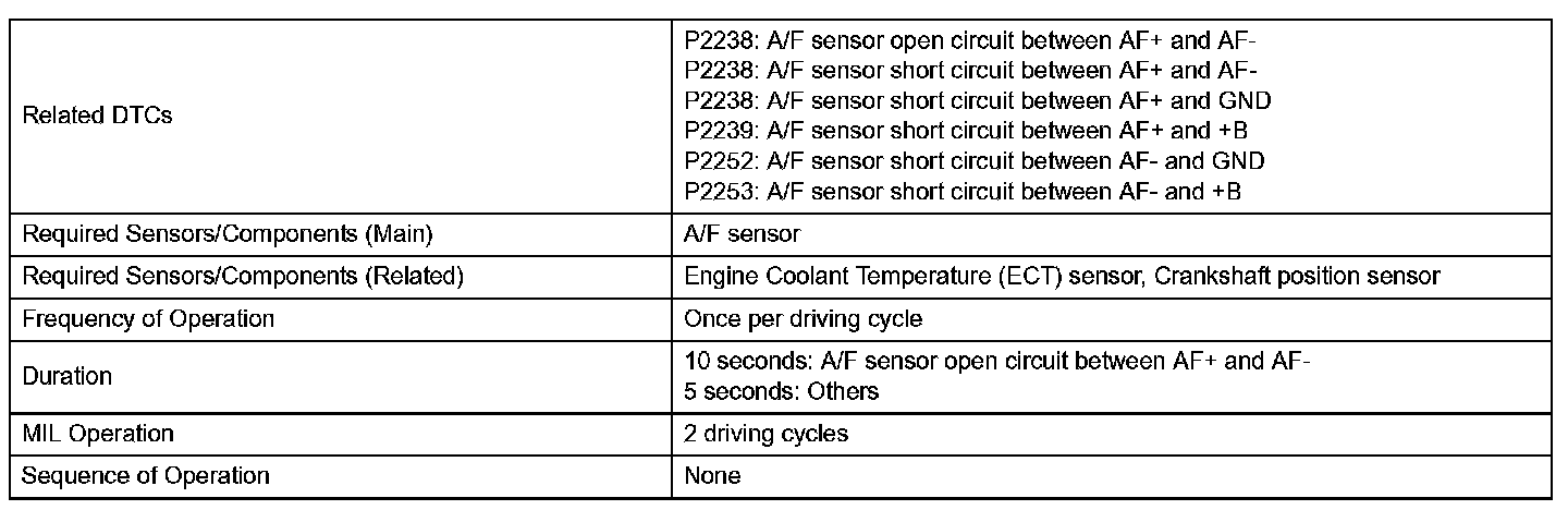 - Although the DTC titles say oxygen sensor, these DTCs relate to the air-fuel Ratio (A/F) sensor.