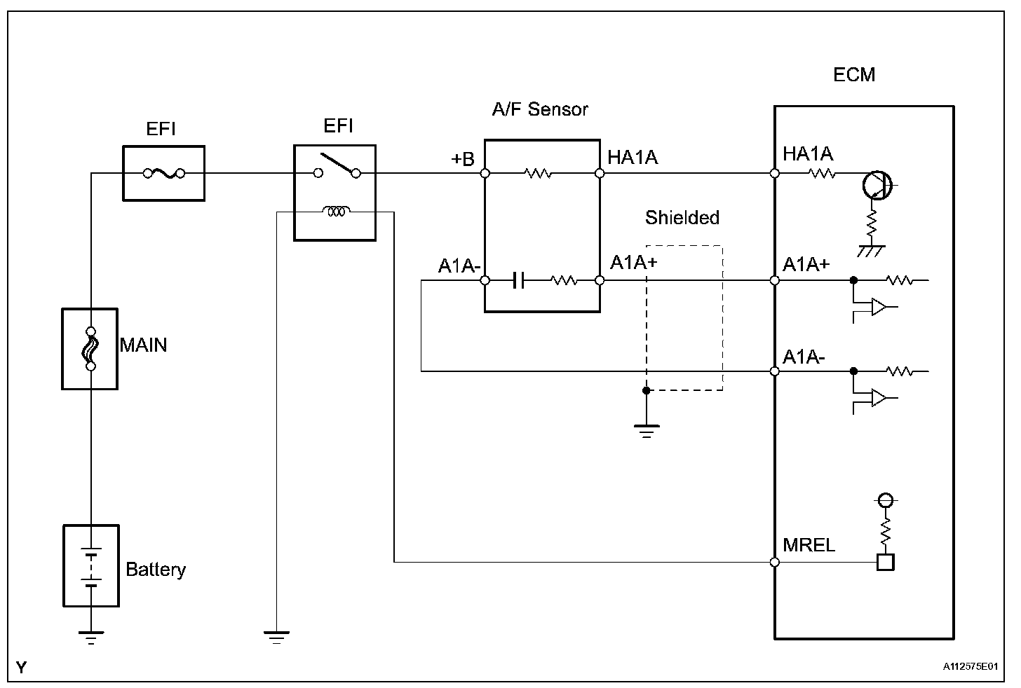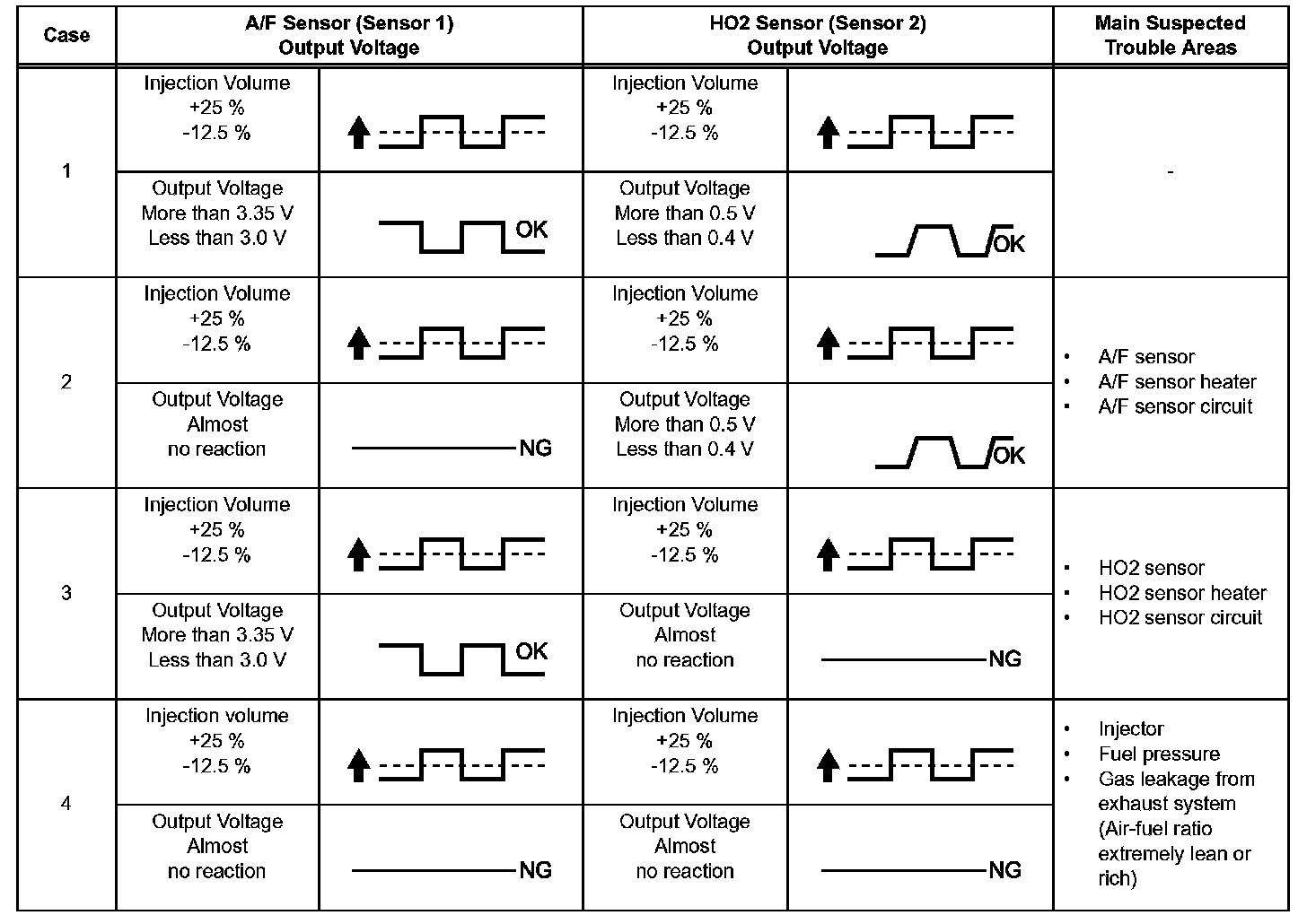 In order to obtain a high purification rate of the carbon monoxide (CO), hydrocarbon (HC) and nitrogen oxide (NOx) components in the exhaust gas, a TWC is used. For the most efficient use of the TWC, the air-fuel ratio must be precisely controlled so that it is always close to the stoichiometric level.Value changes inside the ECM. Since the A/F sensor is the current output element, a current is converted into a voltage inside the ECM. Any measurements taken at the A/F sensor or ECM connectors will show a constant voltage.