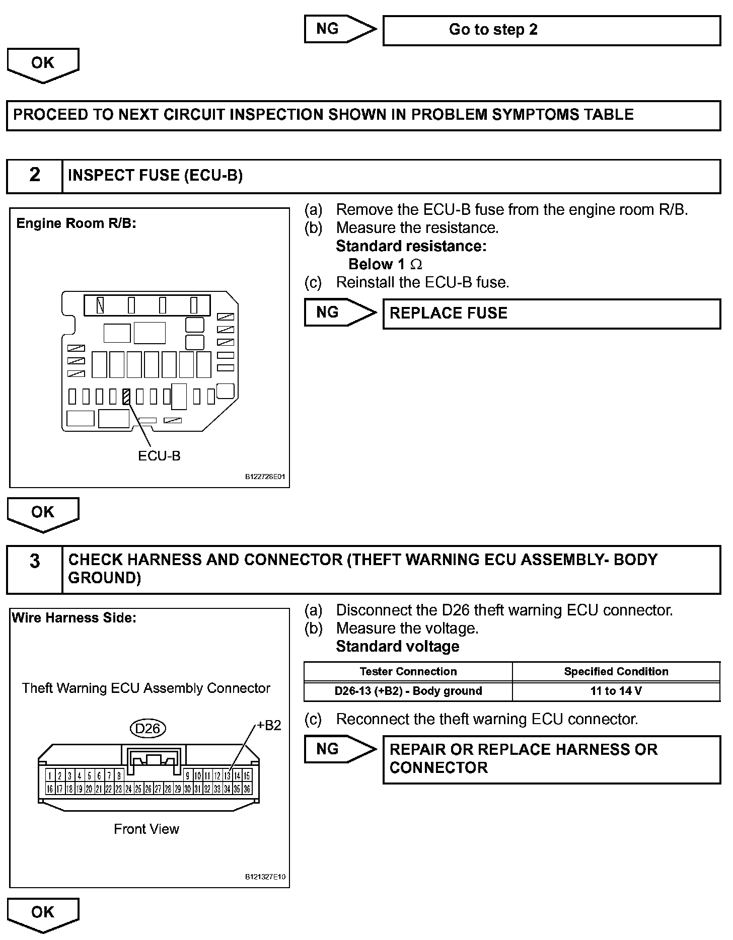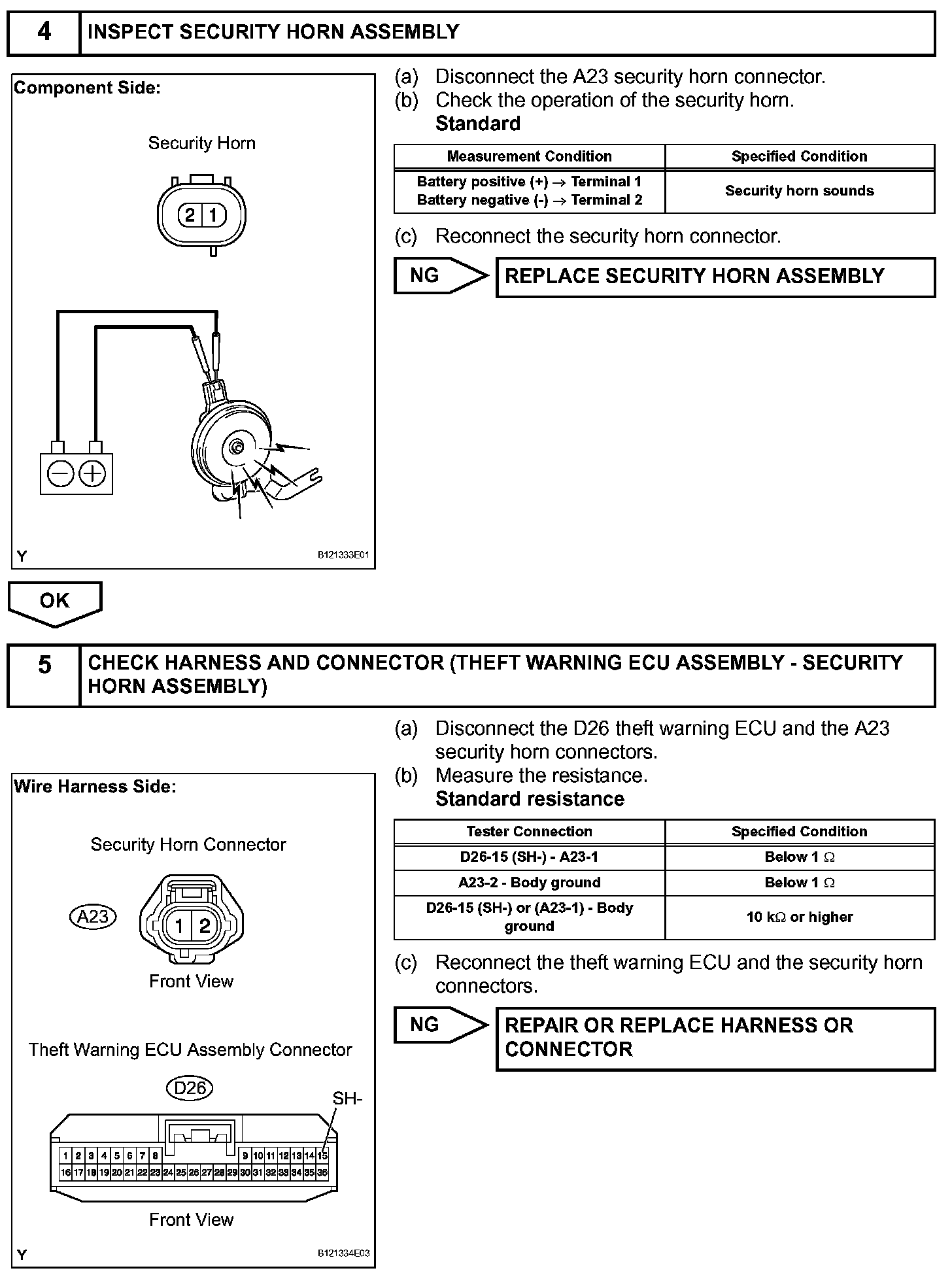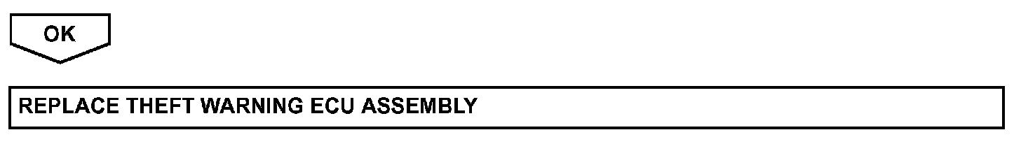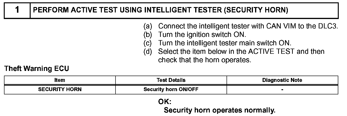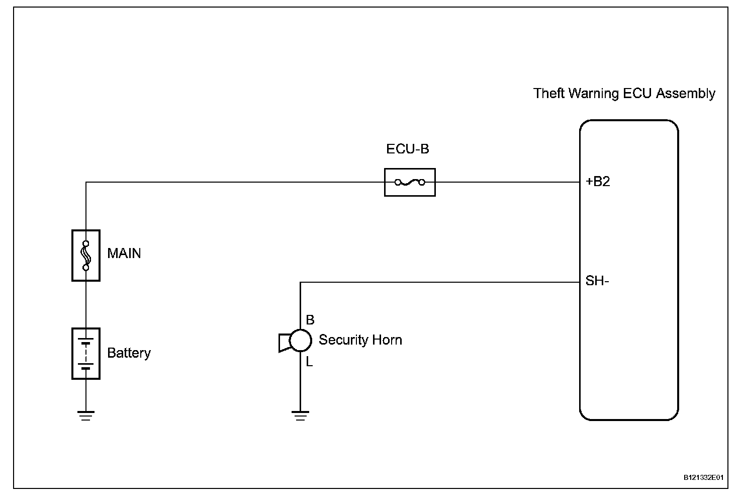 When the theft deterrent system is changed from the armed state to the alarm sounding state, the theft warning ECU can sound the security horn. The horn cycles between ON and OFF at intervals of approximately 0.4 seconds.